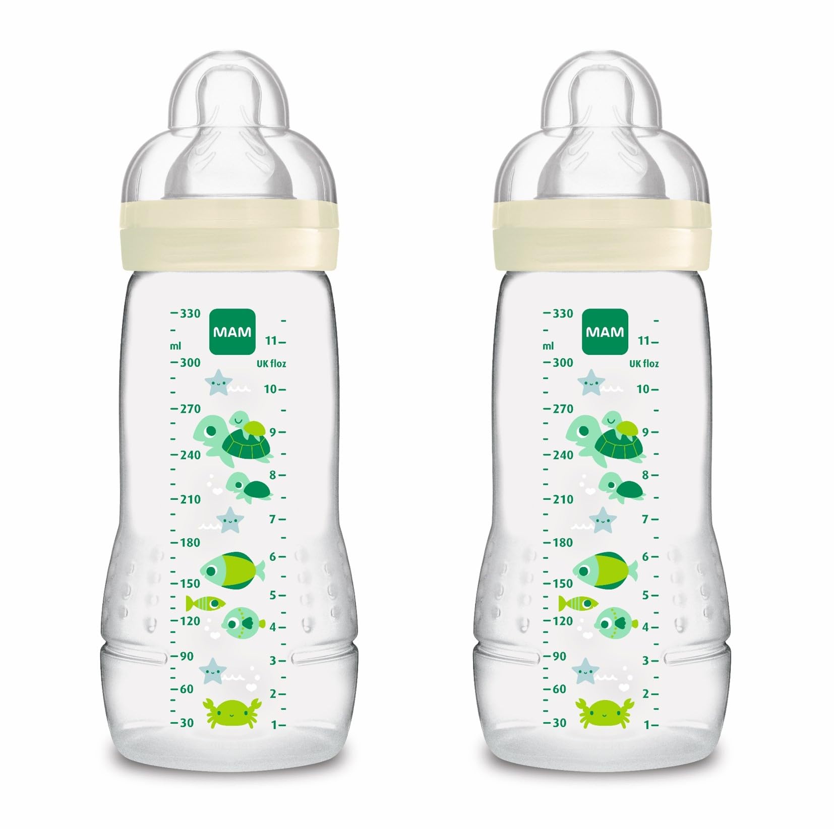 MAM Pack 2 Biberones, a partir de 4 Meses, 330ml, con Tetina 3 de Flujo Rápido de Silicona de Fácil Aceptación, Fácil de Sostener, Fácil de Limpiar, Easy Active, Neutro Brillante, Pack de 2uds