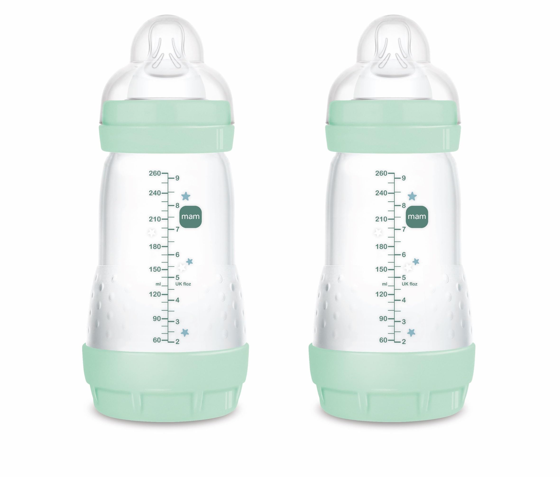 MAM Pack 2 Biberones Anticólicos, 2-4 Meses, 260ml, con Tetina 2 Flujo Medio de Silicona de Fácil Aceptación, Autoesterilizable y Fácil de Limpiar, Easy Start Anti-Colic, Azul Brillante, Pack de 2uds