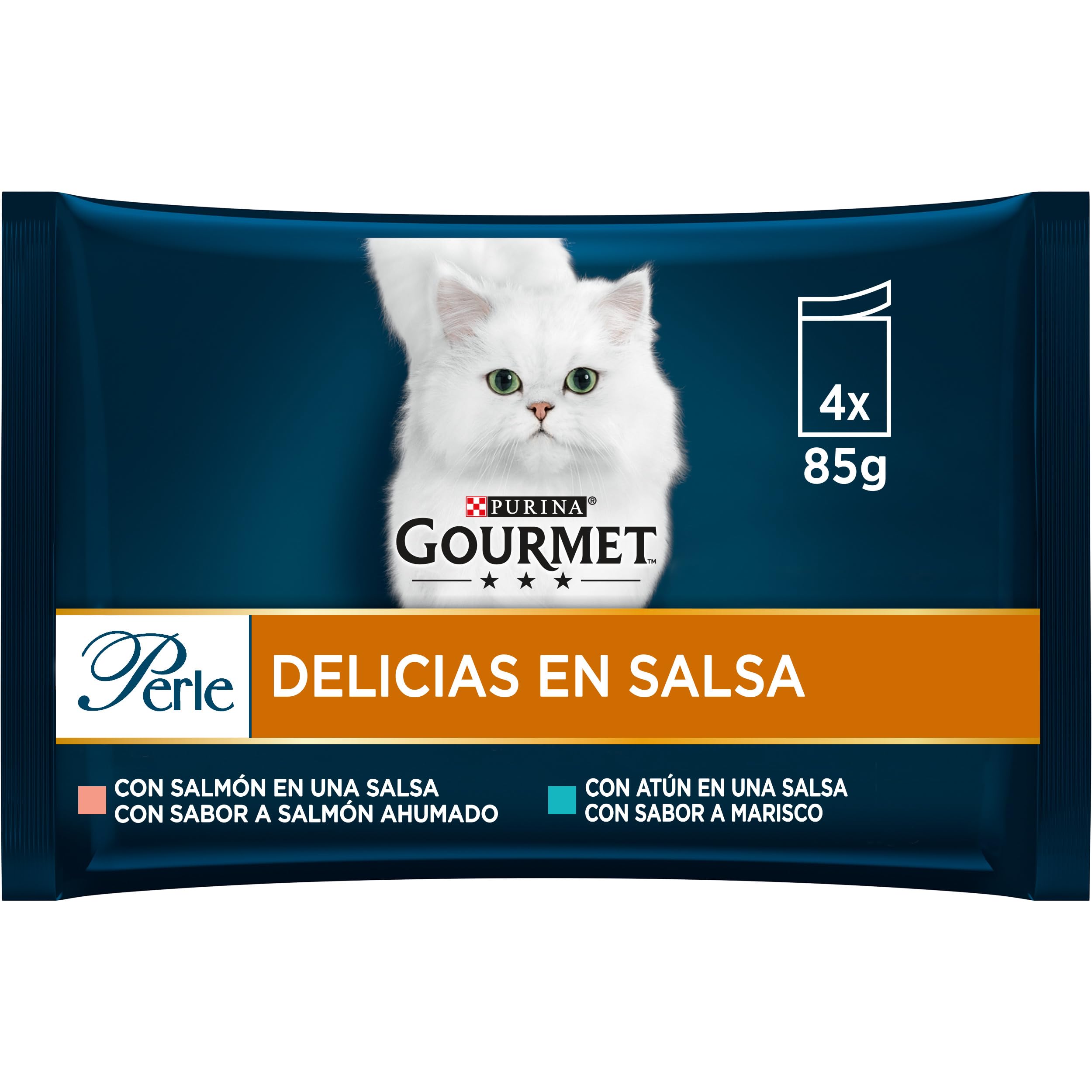 Gourmet Purina Perle Delicias en Salsa, Comida Húmeda para Gato con Salmón y Atún, 12 paquetes de 4 sobres 85g – 48