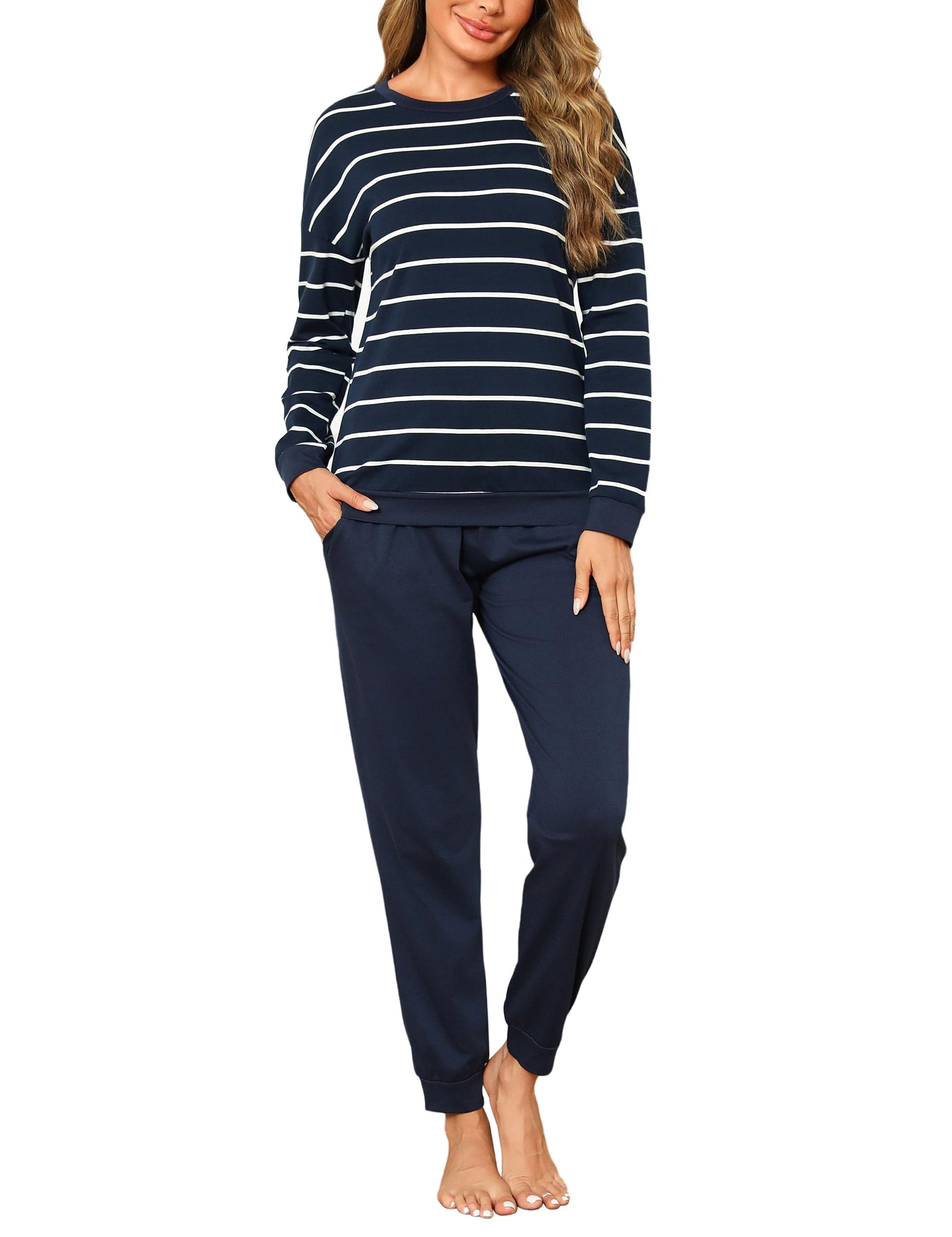 Bresdk Pijamas Mujer Invierno Algodon Rayas Pijama Largo Manga Larga Ropa para Dormir Tallas Grandes