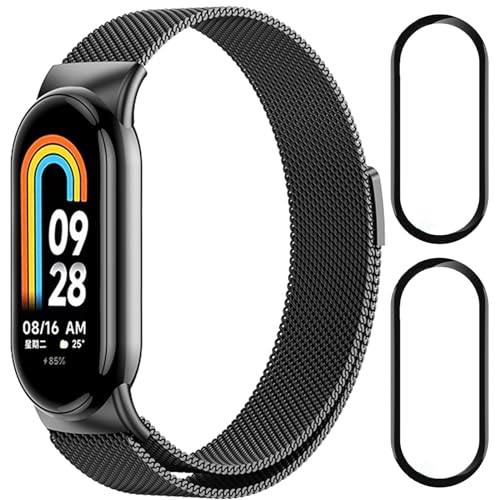 BANGTING Correas Acero Inoxidable Compatible con Xiaomi Mi Band 9 y Xiaomi Mi Band 8, Correa Metalica de Repuesto y 2 Protectores de Pantalla para Mi Band 9 (Negro (Imán))