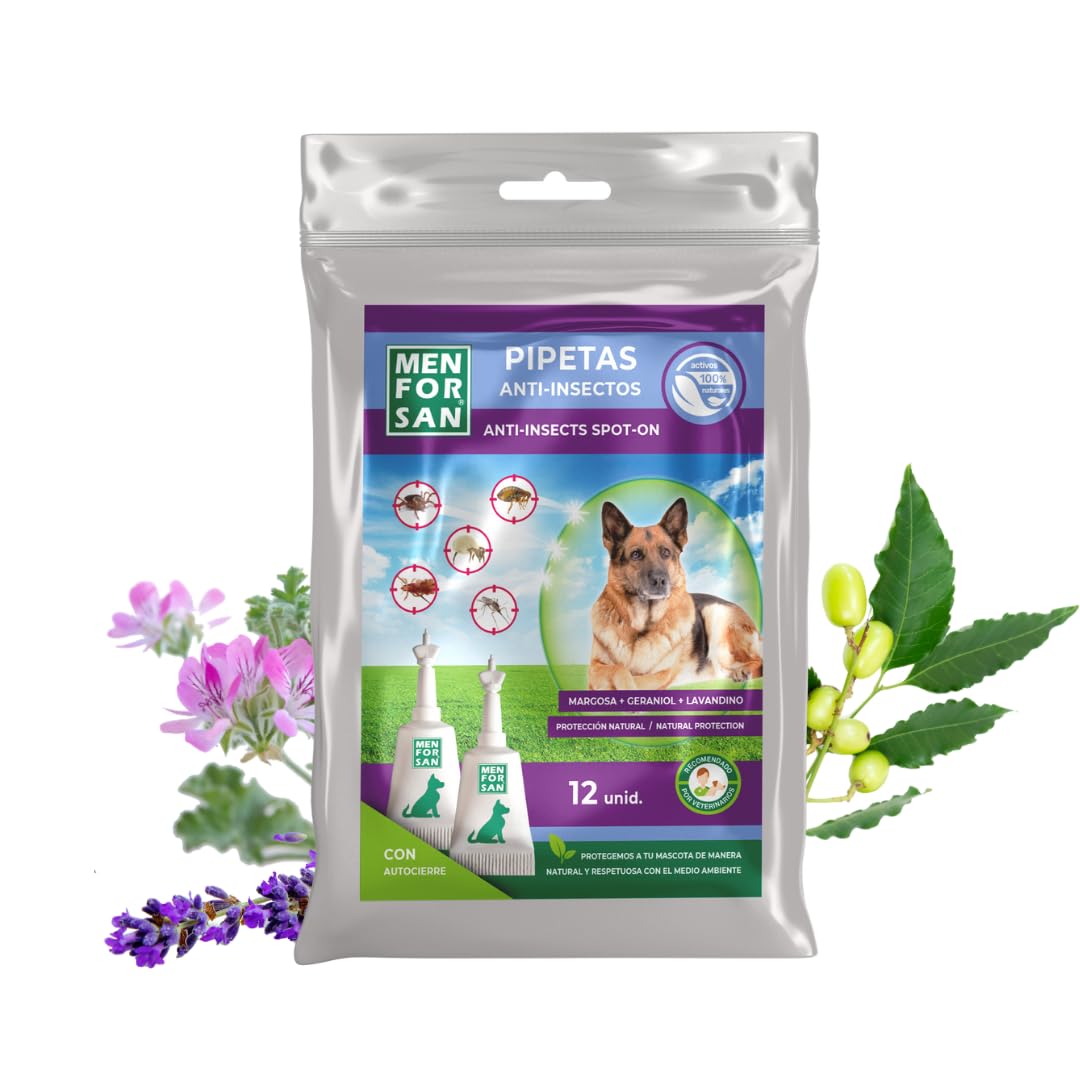 MENFORSAN Pack con 12 pipetas Anti-Insectos para Perros, con Margosa, geraniol y lavandino, con Bolsa autocierre