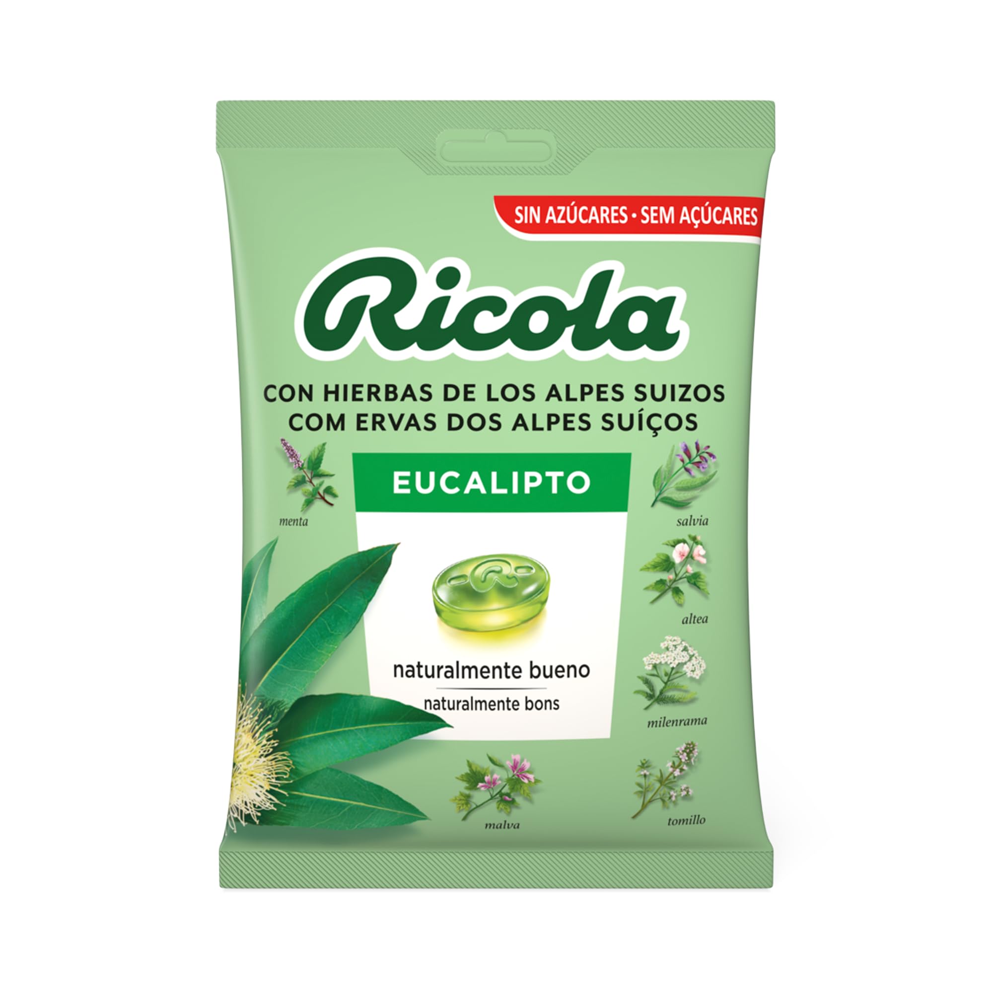Ricola – Eucalipto, Caramelos Duros, Refresca y Alivia la Garganta y las Vías Respiratorias, con Aceites Esenciales de Menta, Eucalipto y 13 Hierbas Suizas, Sin Azúcar, con Edulcorante – Bolsa 70 g
