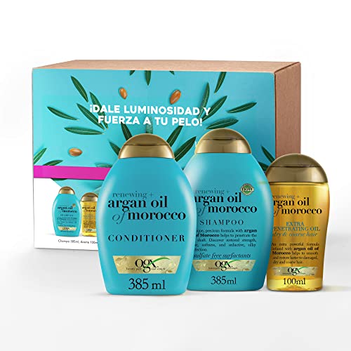 OGX Renewing Argan Oil of Morocco Rutina, Set de champú (1×385 ml), acondicionador hidratante ( 1×385 ml) y aceite para el pelo (1×100 ml) para cabello seco y dañado, gama con aceite de argán