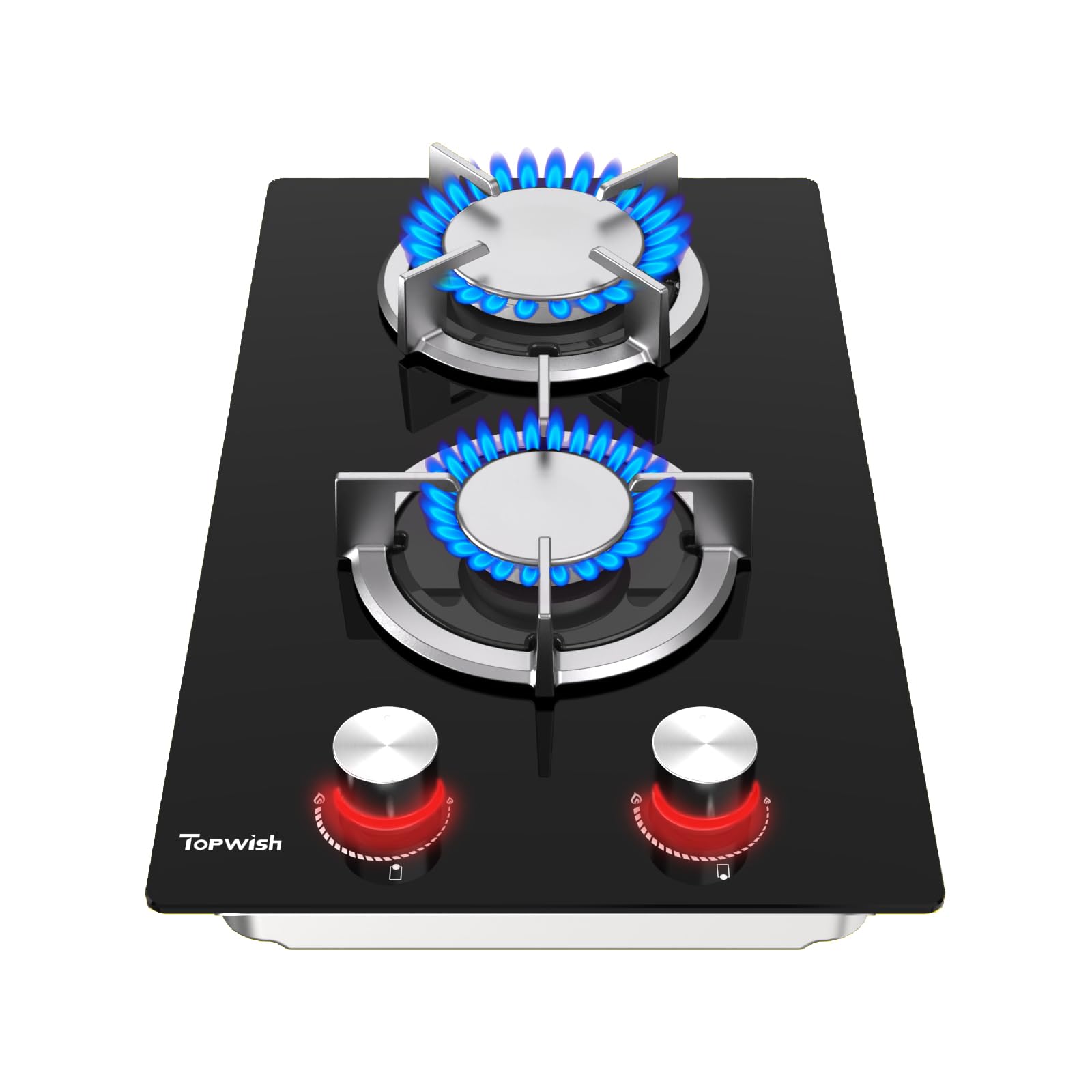 Topwish cocina de gas butano 2 fuegos, cocina de gas dos fuegos, placa de cocina encastrable 30cm con rojo mando giratorio iluminado, NG/LPG convertible, protección contra apagado de llama, 4750W