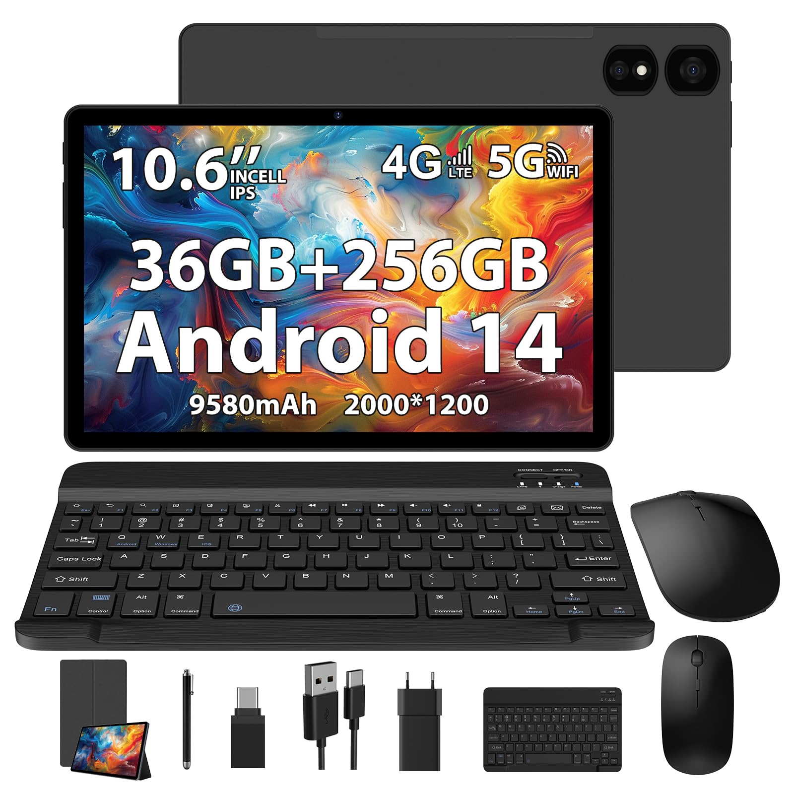 TIGERFU Android 14 Tablet, 10.6 Pulgadas Tablet con Teclado y Ratón, RAM 36GB+ROM 256GB (TF 2TB), Tarjeta SIM 4G LTE+5G WiFi, 2.0GHz Octa-Core, 8MP+13MP, 9580mAh, BT5.0, 2000 * 1200 IPS – Negro