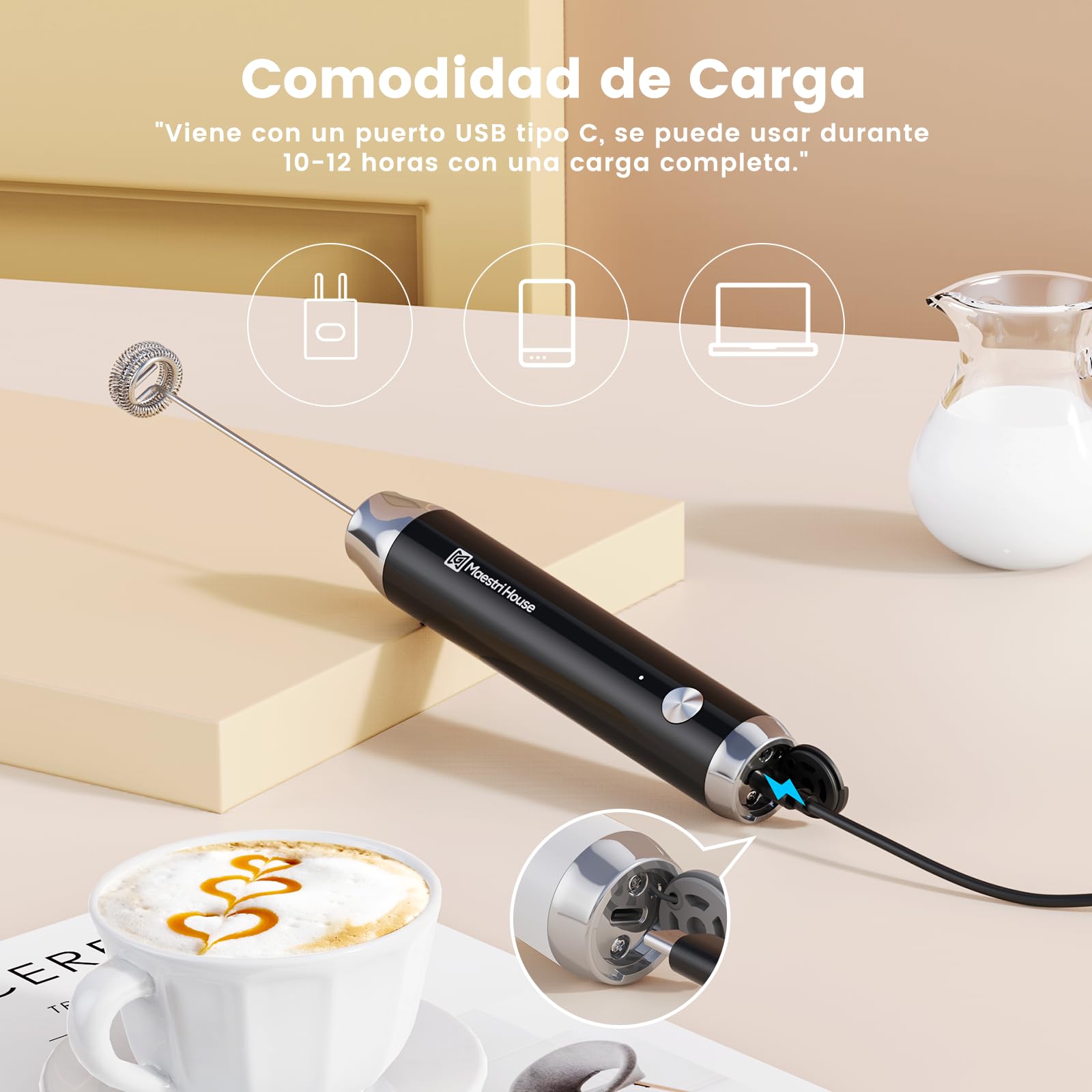 Maestri House Espumador de Leche, Recargable Espumador Leche Electrico con Agitador de Acero Inoxidable, Impermeable Mini Batidor Electrico para Café, matcha, Lattes, capuchino, LunaFro NS