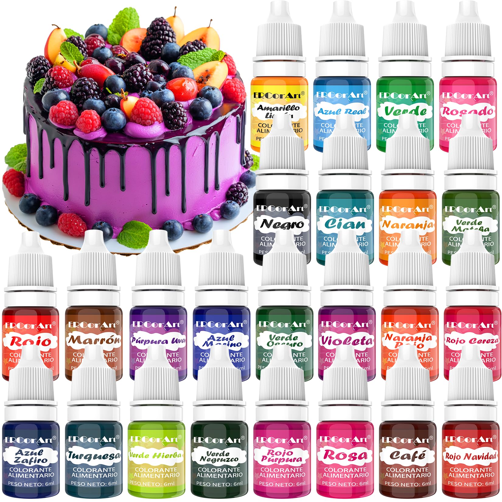 Colorante Alimentario – 24 Colores Colorantes Alimentarios Reposteria de Alta Concentración, para Fondant Blanco, Harina, Huevos, Tarta, Natillas y Donuts, para Halloween, Navidad, Pascua – 6 ml