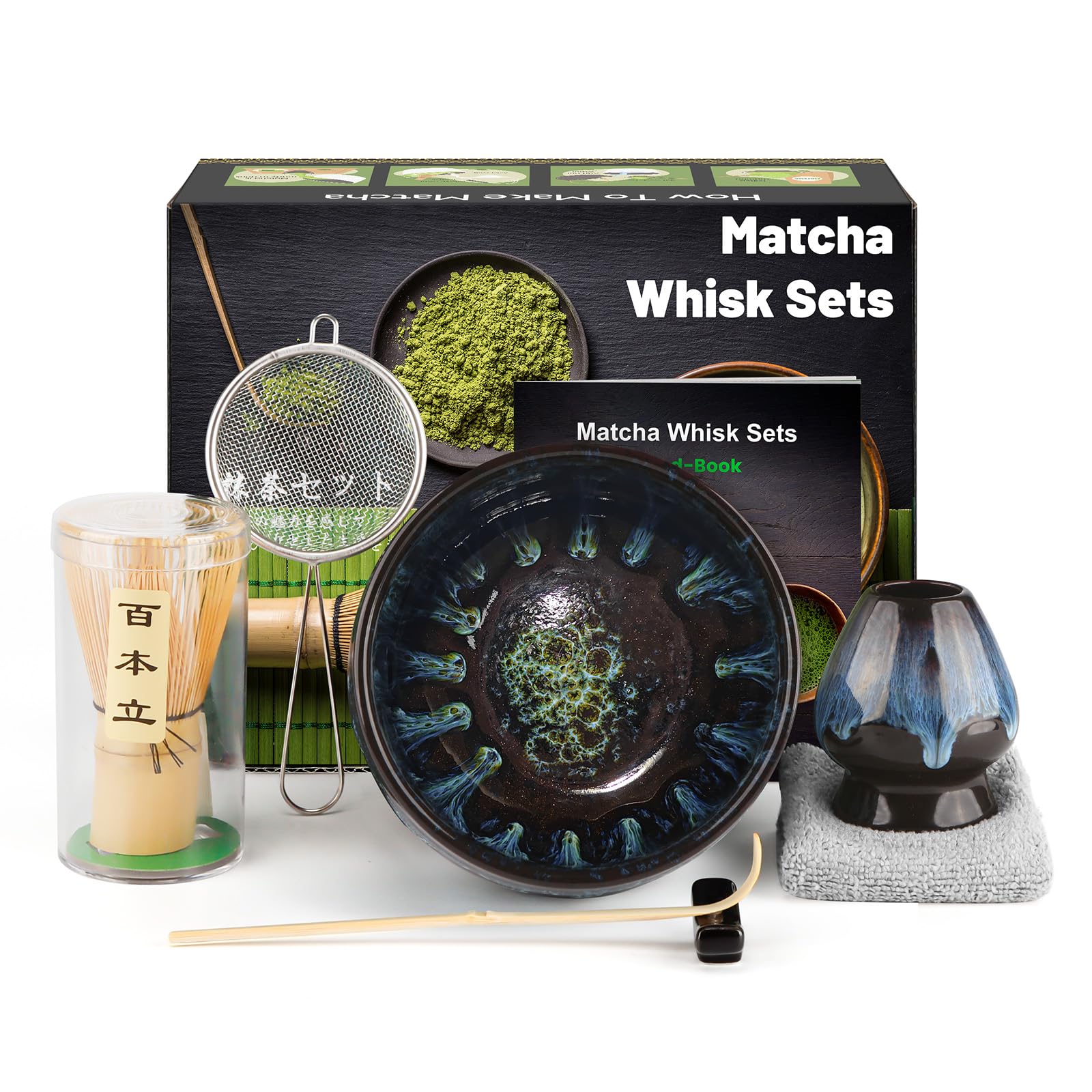Juego de té de Matcha, juego de té japonés con escoba matcha, cuenco para matcha y soporte para escoba, cuchara de matcha, colador, toalla de té, accesorios matcha (7 piezas), color negro