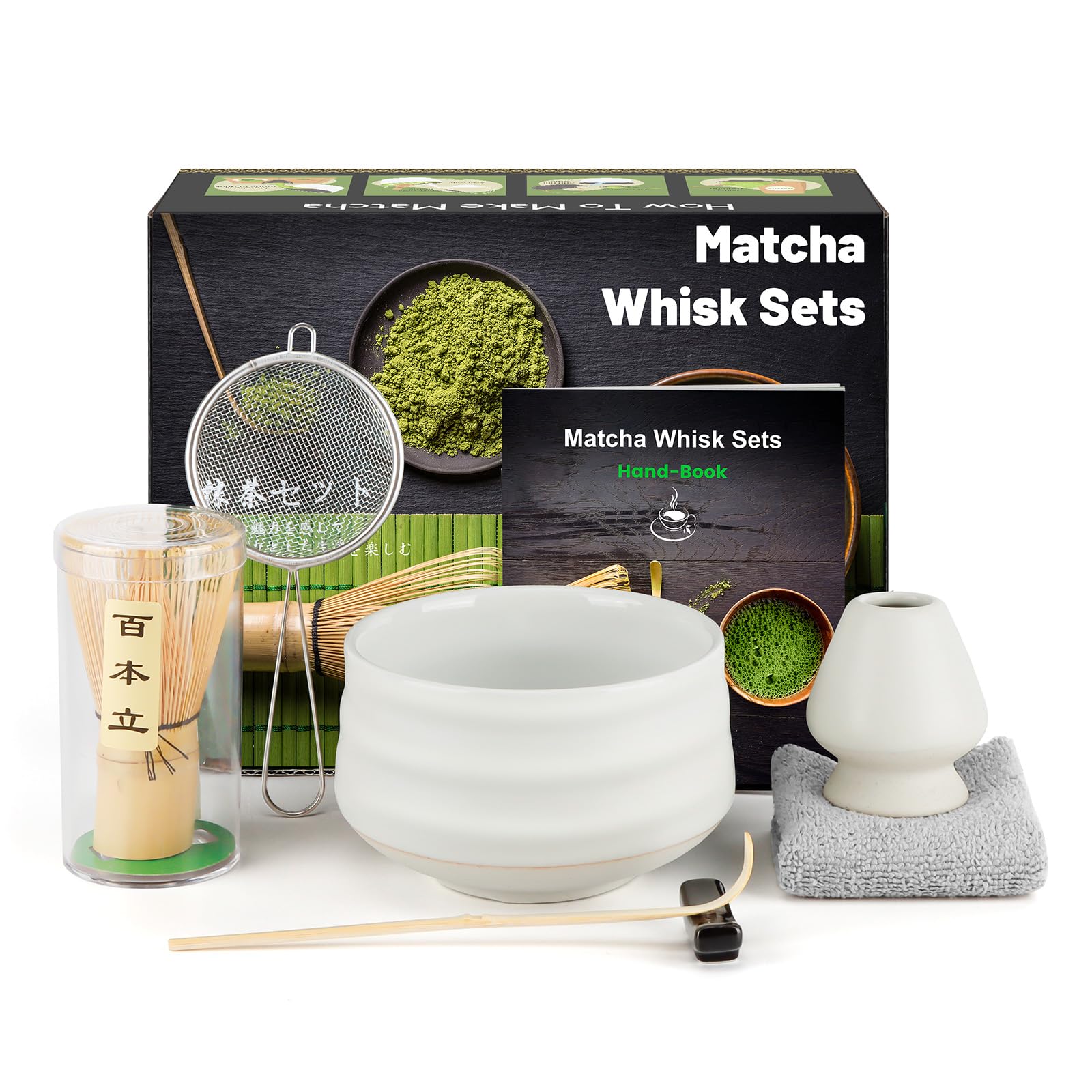 Juego de té de Matcha, juego de té japonés con escoba matcha, cuenco matcha y soporte para escoba de cerámica, cuchara de matcha, colador, toalla de té, accesorios para matcha (7 piezas), color gris y