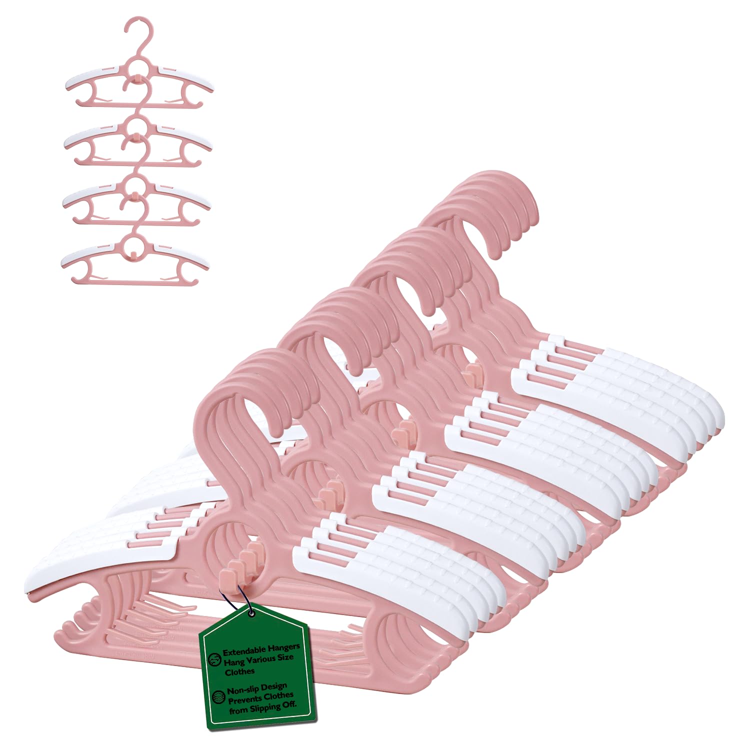 MangoKit 20 Paquetes de Perchas de Plástico para Bebé,Extensibles,Ajustables Niños de 28-36.8cm con Ganchos Apilables,Perchas Antideslizantes y Ahorradoras de Espacio para Bebé,Niño,Adolescente (Rosa)