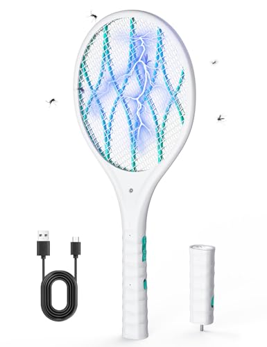 AROEVE Raqueta Mosquitos Electrica, 4000V Raqueta Matamoscas Electrica, Carga USB, Luz LED, Linterna Desmontable, Protección de 3 Capas, Doble Interruptor, Hogar, Jardín, Blanco