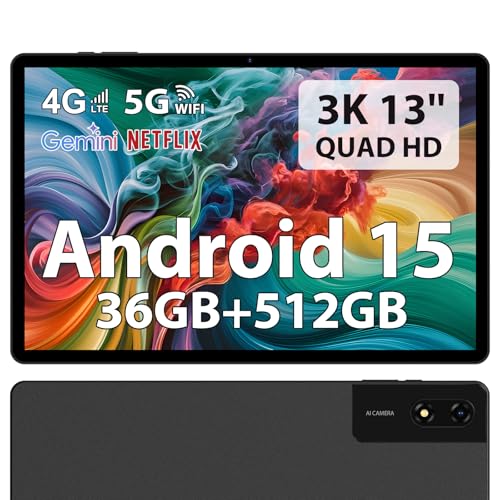 LEVIRTU Tablet 13 Pulgadas Android 15 Octa-Core 2.2GHz/36GB RAM+512GB ROM(TF 2TB) FHD 2944 * 1840, Gemini AI, 11580mAh/4G LTE+5G WiFi/Widevine L1/BT5.0/GPS/13MP Tablets con Teclado y Lápiz, Negro
