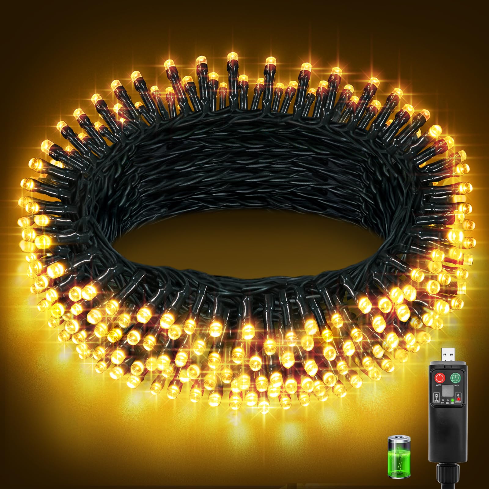 Luces Navidad Exterior, 10+3M 100LED Luces Arbol Navidad Recargables USB con 800mAh Batería, 8 Modos, 3 Temporizadores, Función de Memoria, IP44 Impermeable Guirnalda Luce Exterior, Blanco Cálido