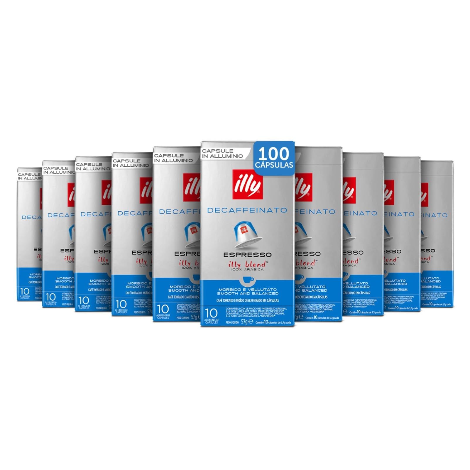 illy, Café en Cápsulas Compatibles en Aluminio DESCAFEINADO, 100% Arábica con Notas de Caramelo, Chocolate y Pan Tostado, Sin Cafeína, Sabor Equilibrado, 10 Paquetes de 10 (100 Cápsulas en Total)