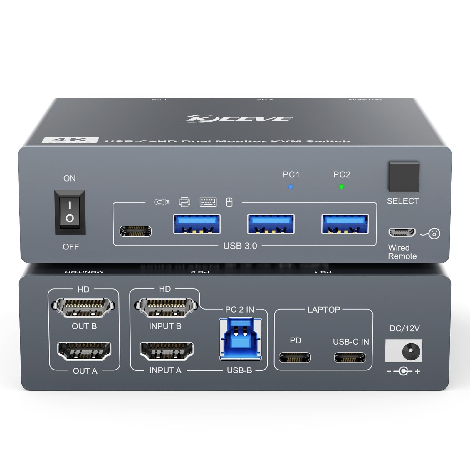 MLEEDA KVM Switch 2 Monitores para 1 Portátile y 1 Escritorio 4K@60Hz,USB C HDMI Switch KVM,Conmutador KVM con 4 Puertos USB 3.0, PD de 80W, Incluido Remoto por Cable,Cable USB C y Adaptadores de 12V