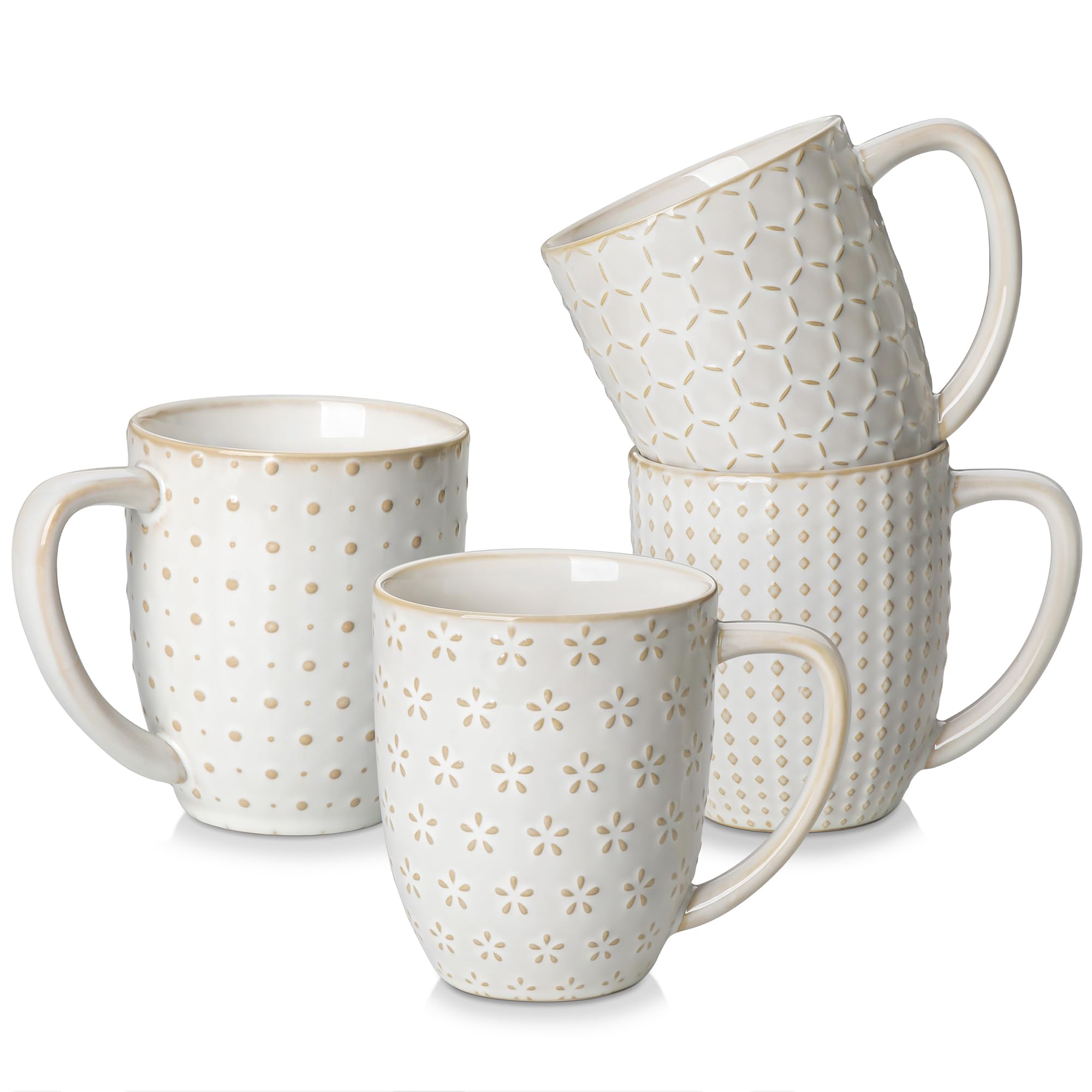 MALACASA 4 Piezas Tazas de Café de Gres, 480ML Grandes Tazas Desayuno con Estampado en Relieve para Coffee, Te, Leche, Beige – Serie LYDIA