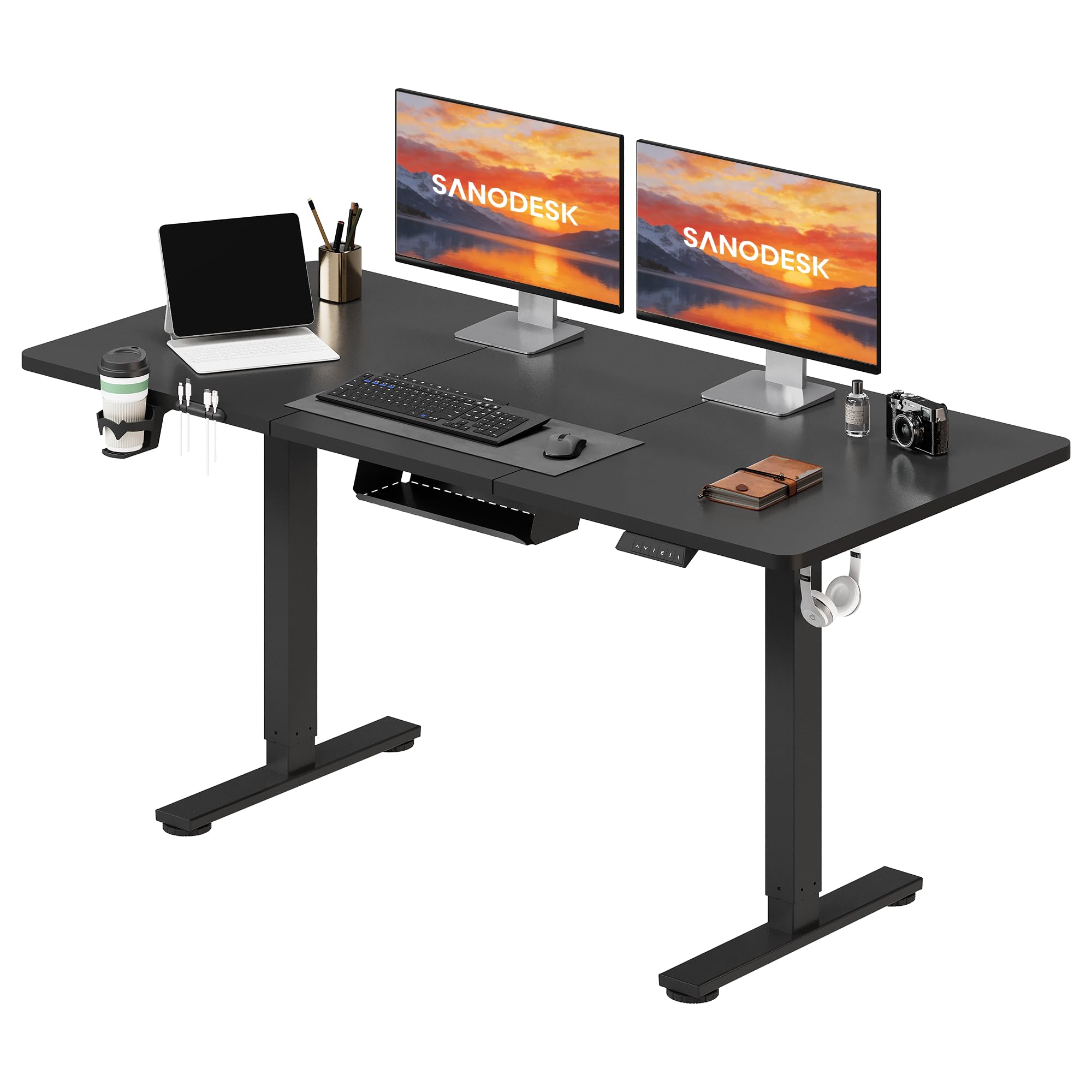 SANODESK Escritorio Elevable Eléctrico 120x60cm, Mesa Ajustable en Altura con Sistema Anticolisión, Función de Memoria de 4 Alturas con Gancho y Caja de Almacenamiento, Negro