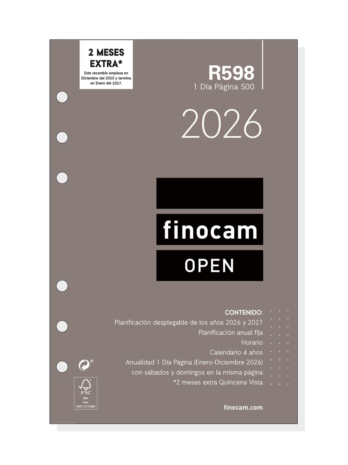 Finocam – Recambio agenda Open 2026 1 Día Página | Enero – Diciembre (12 meses) | Recambio anual agenda R598 con 6 taladros – Español