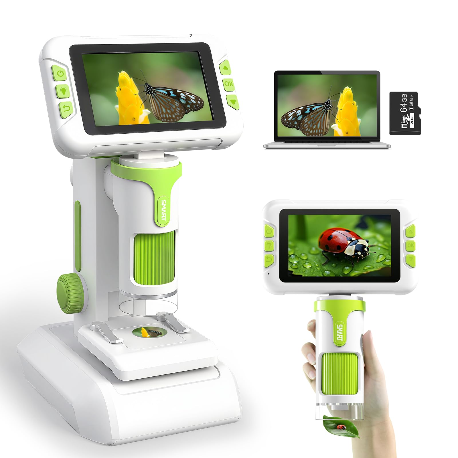 Charmofun Microscopio para Niños, Microscopio Portátil Niños con Tarjeta de Memoria de 64G, Microscopios Digital Infantil con Pantalla LCD de 4″, Aumento 1600X, Fotos y Videos, Función Portátil y Fija