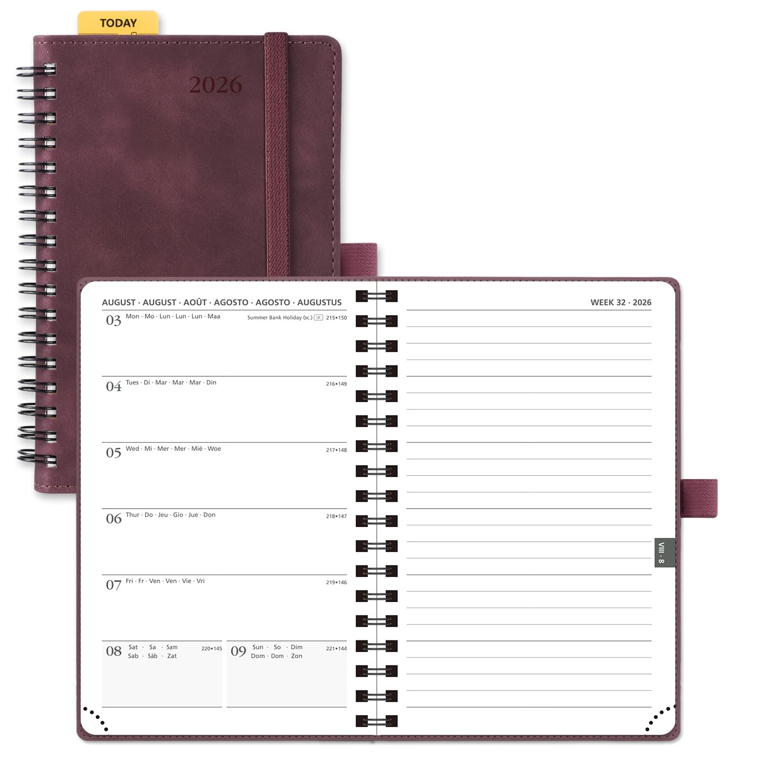 POPRUN Agenda 2026 Semana Vista Espiral, Pequeña 16 x 10,5 cm con Regla Posicionable, Tapa Blanda, Una Página por Semanal con Una Página de Notas, 100 GSM Papel EU, Borgoña Oscuro