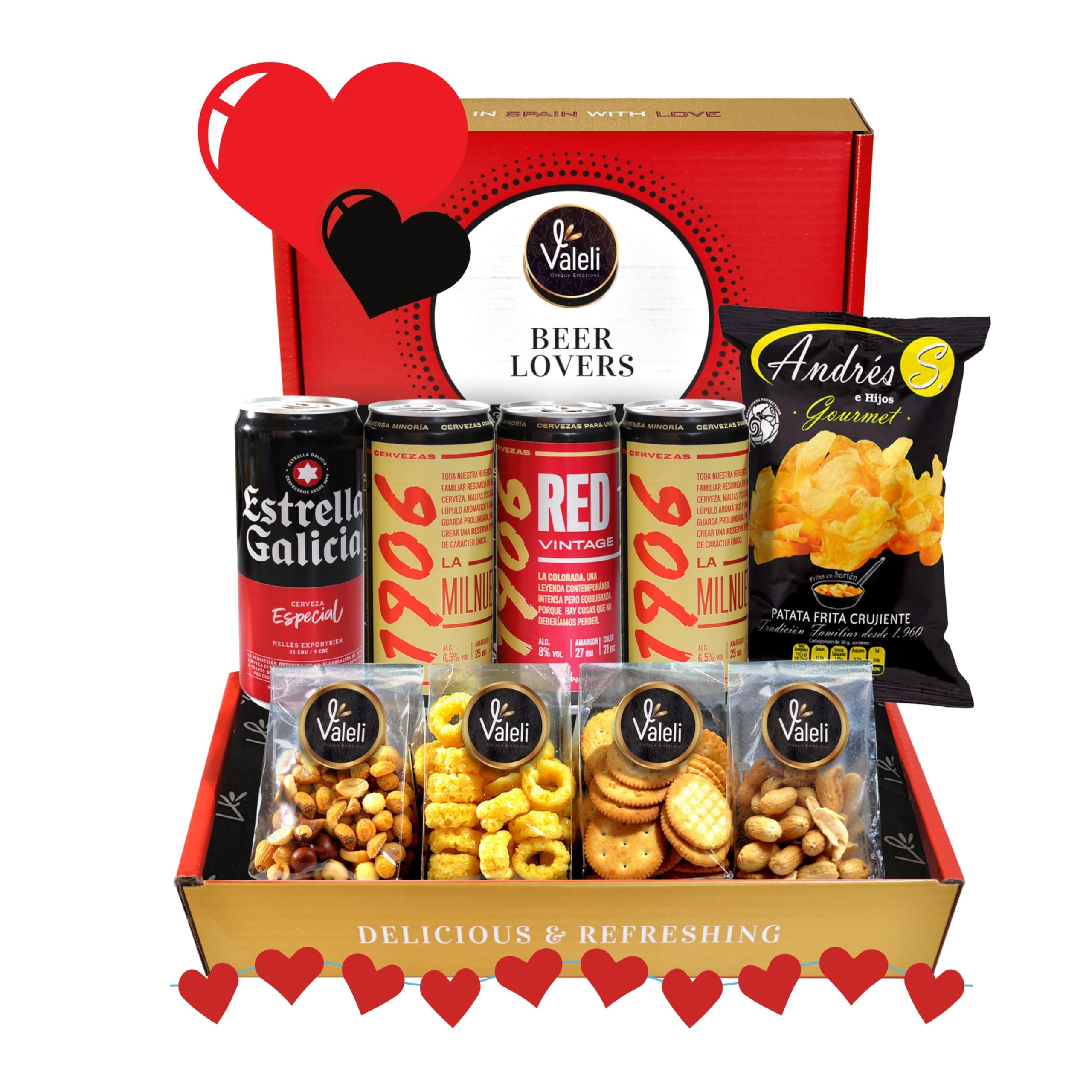 Valeli.Cesta Cervezas Estrella Galicia. Cesta gourmet regalo original con frutos secos y snacks. Regalo para él, ella, amigo, SAN VALENTÍN, cumpleaños, padre, enamorados (ESTRELLA GALICIA)
