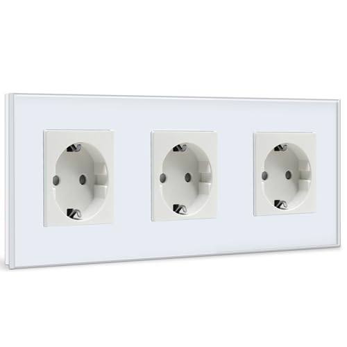 BSEED Enchufe de Pared Triple,Blanco Schuko Enchufe Triple con Panel de Cristal,16A 250V Toma de Corriente,Enchufes de Extensión para Cocina,Dormitorio,Oficina,Hotel,etc