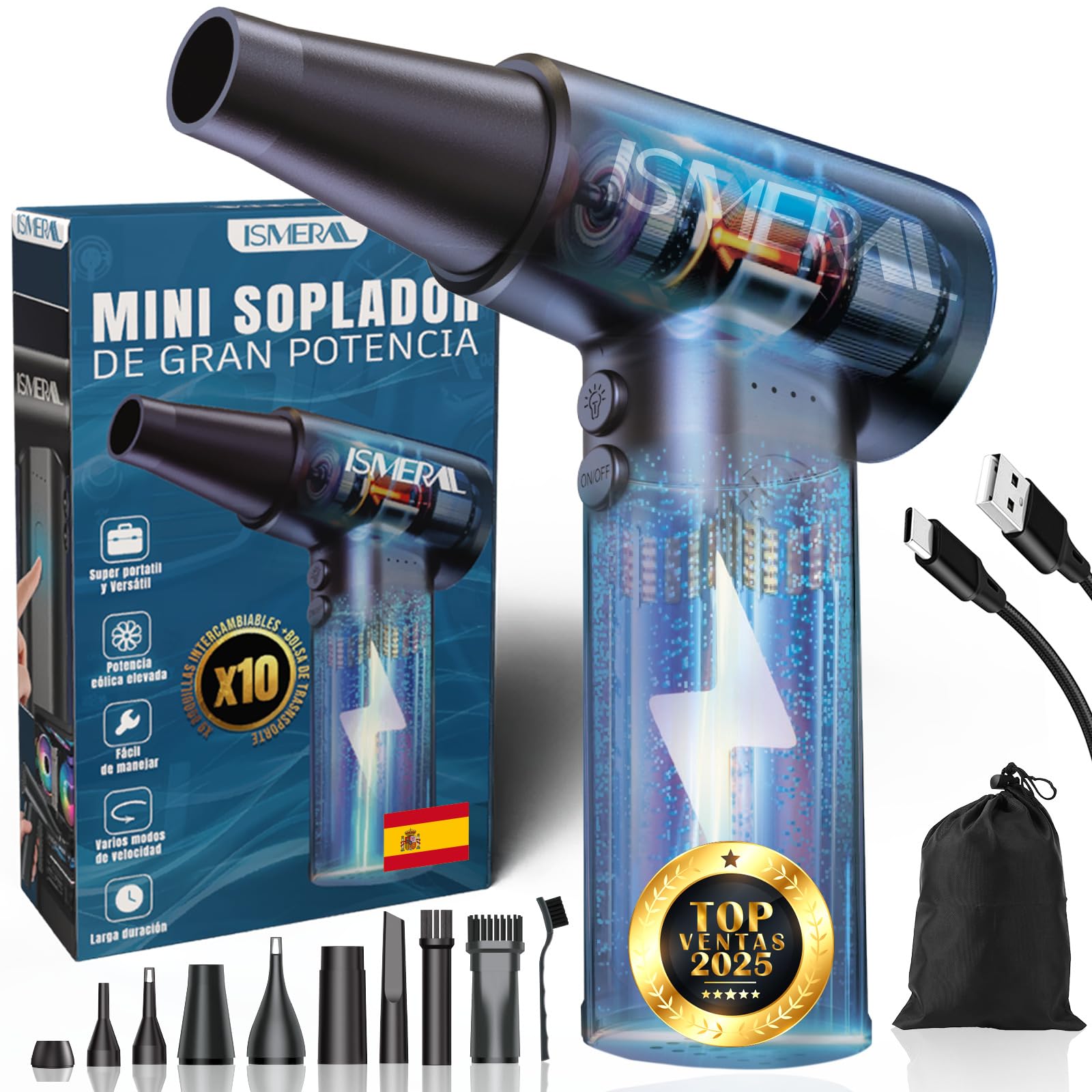 SÚPER Soplador De Aire Potente, 150000RPM BRUSHLESS ISMERAL® + 9 Boquillas + Cepillo + Bolsa de Transporte | Soplador Bateria 6000mAh | Aire Comprimido Limpieza pc | Soplador De Aire para pc |