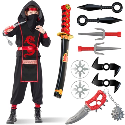Lozzzyo Disfraces Ninja de Carnaval para Niños con Ropa Ninja y Armas Variadas, Disfraz de Dragón para Niños, Ideal para Carnaval, Halloween, Cosplay y Actuaciones Escénicas (S)