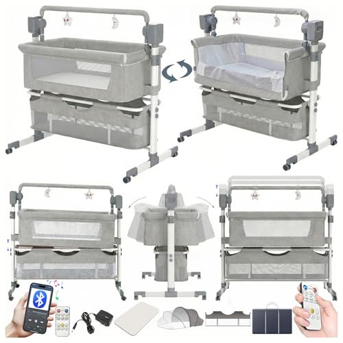 Doraystar Eléctrico Bluetooth Inteligente Cuna Colecho Bebe, Minicuna Colecho Bebe Plegable Convertible, Cuna Next to me con Colchon, Música, 5 Engranajes de Balanceo y Control Remoto (601 Light Grey)