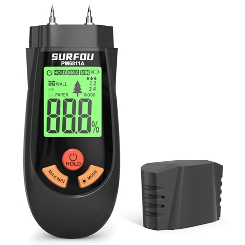 SURFOU Medidor de Humedad para Pared, Madera y Papel, Higrometro Digital con 3 Modos, Pantalla LED y Alarma de 3 Colores, Ideal para Construcción, Bricolaje y Reformas
