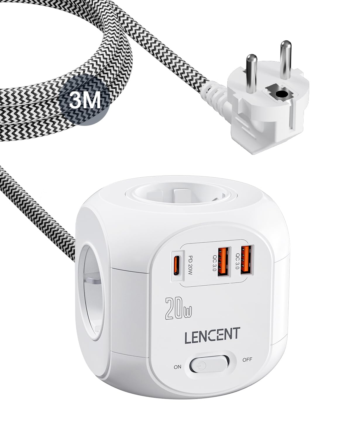 LENCENT Cubo Regleta Enchufes 3M con Carga Rápida PD20W, Enchufes Regleta para Uso Interior, Regleta USB con 4 Tomas de CA, 2 USB y 1 Tipo C para Hogar, Cocina y Oficina