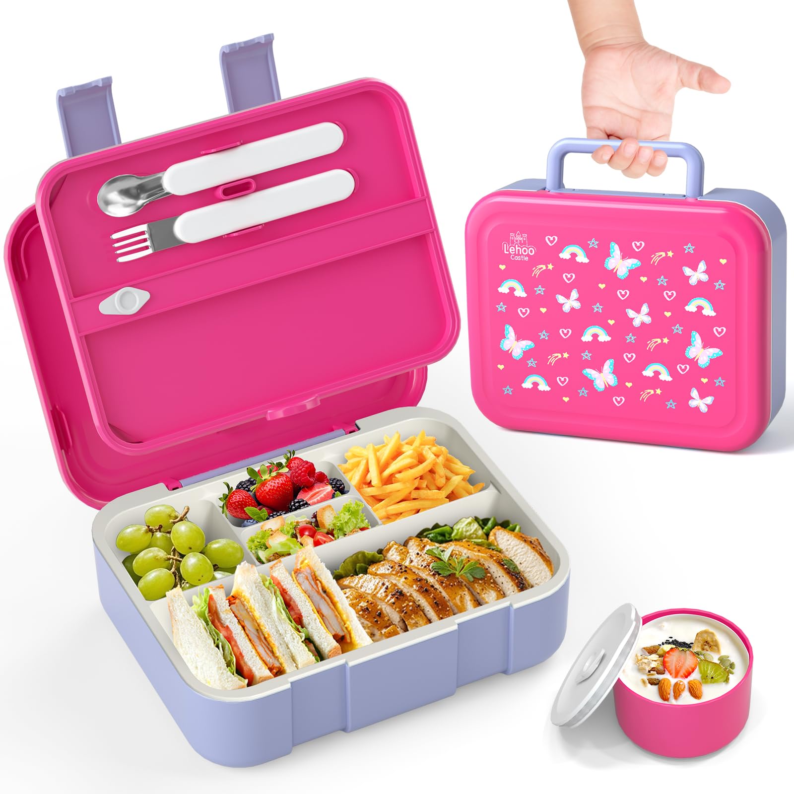 Lehoo Castle Fiambrera Infantil y Antigoteo para Niños, 1250ml – Fiambrera Chica Bento Box con Tenedor, Cuchara, 5 Compartimentos y Salsero (Mariposa)