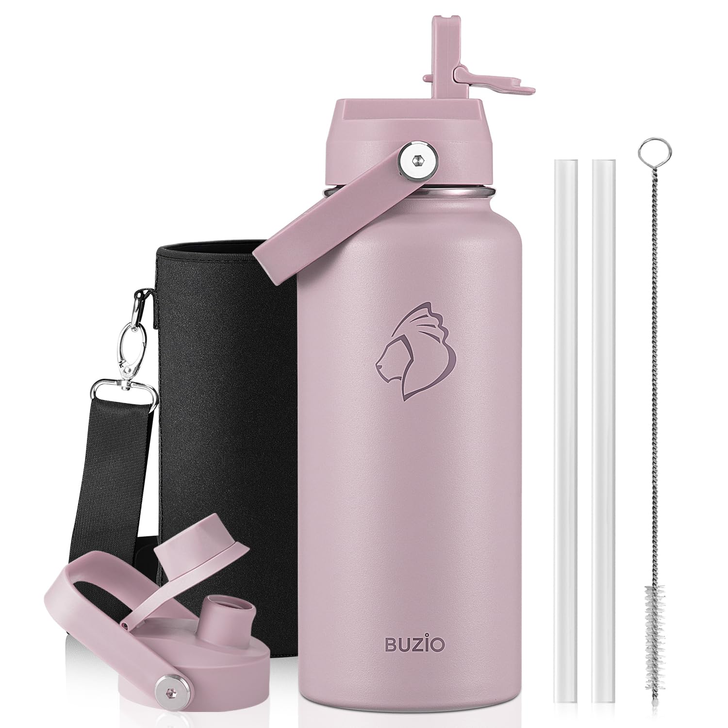 Botella de agua aislada BUZIO de 1 L, triple vacío de acero inoxidable con tapón de pajita, botella deportiva hermética para senderismo y deporte, mantiene frío 48h, Rubí Rojo/Morado