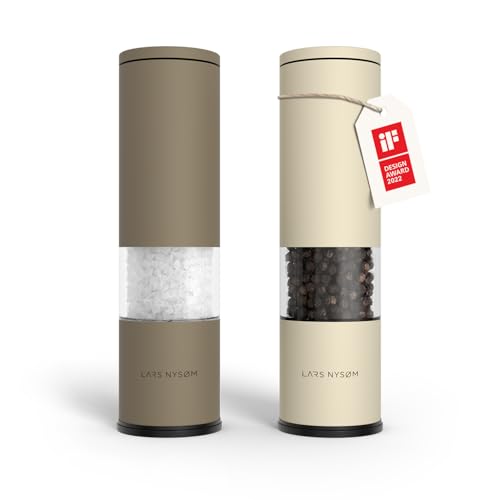 LARS NYSØM Juego de 2 molinillos de sal y pimienta manuales con molinillo de cerámica ajustable de grueso a fino I Juego de molinillos de especias de diseño (Brown/Beige)