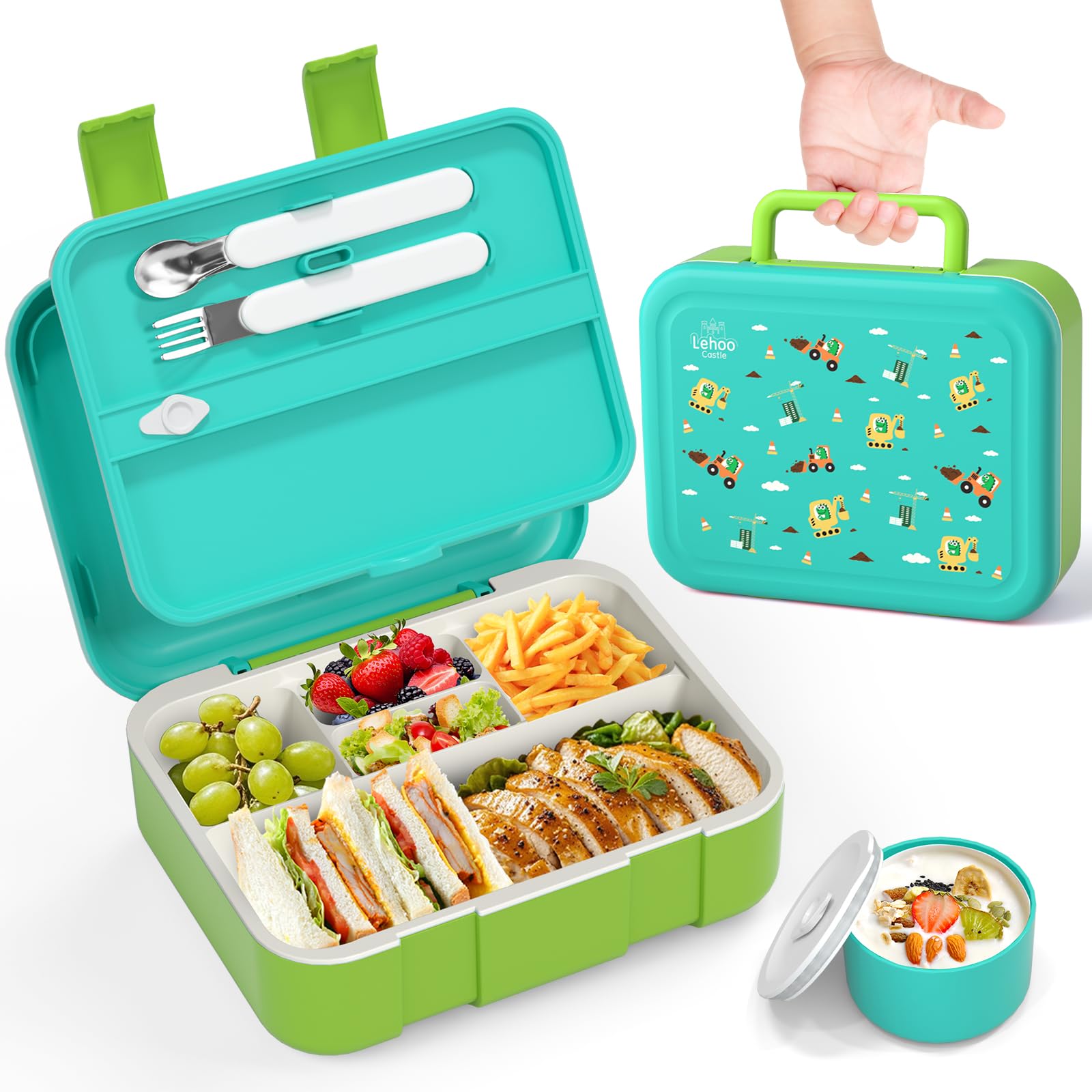 Lehoo Castle Fiambrera Infantil y Antigoteo para Niños, 1250ml – Fiambrera Chica Bento Box con Tenedor, Cuchara, 5 Compartimentos y Salsero (Excavadora Dinosaurios)