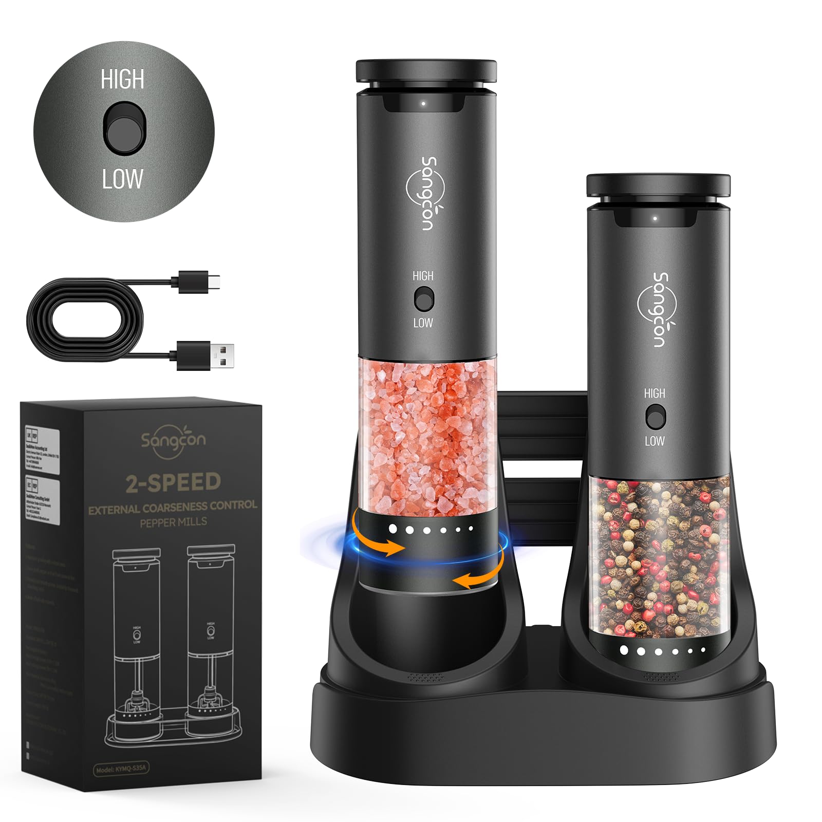 Sangcon 2 Velocidades Molinillo de sal y pimienta eléctrico, molinillo automático con 6 Niveles de Grosor Ajustables Desde el Exterior, con Base de Almacenamiento de Recargable USB(Gris Metalizado)