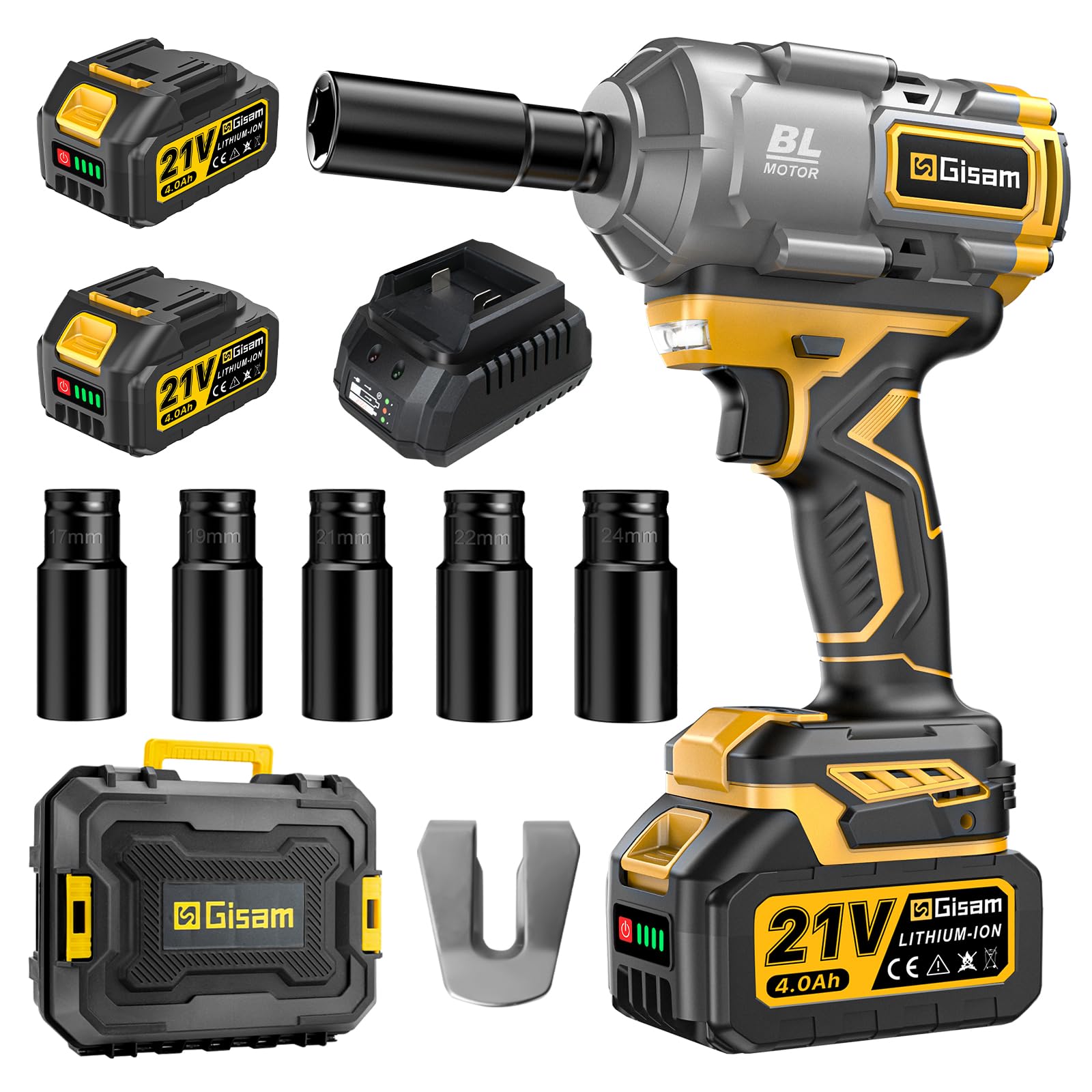 Gisam Llave de Impacto de 650 N.m sin escobillas, Llave de Impacto Eléctrica de 1/2 pulgada con Batería de 2×4.0Ah, Cargador Rápido, Destornillador de Impacto con 5 Tomas para el Coche y el Hogar