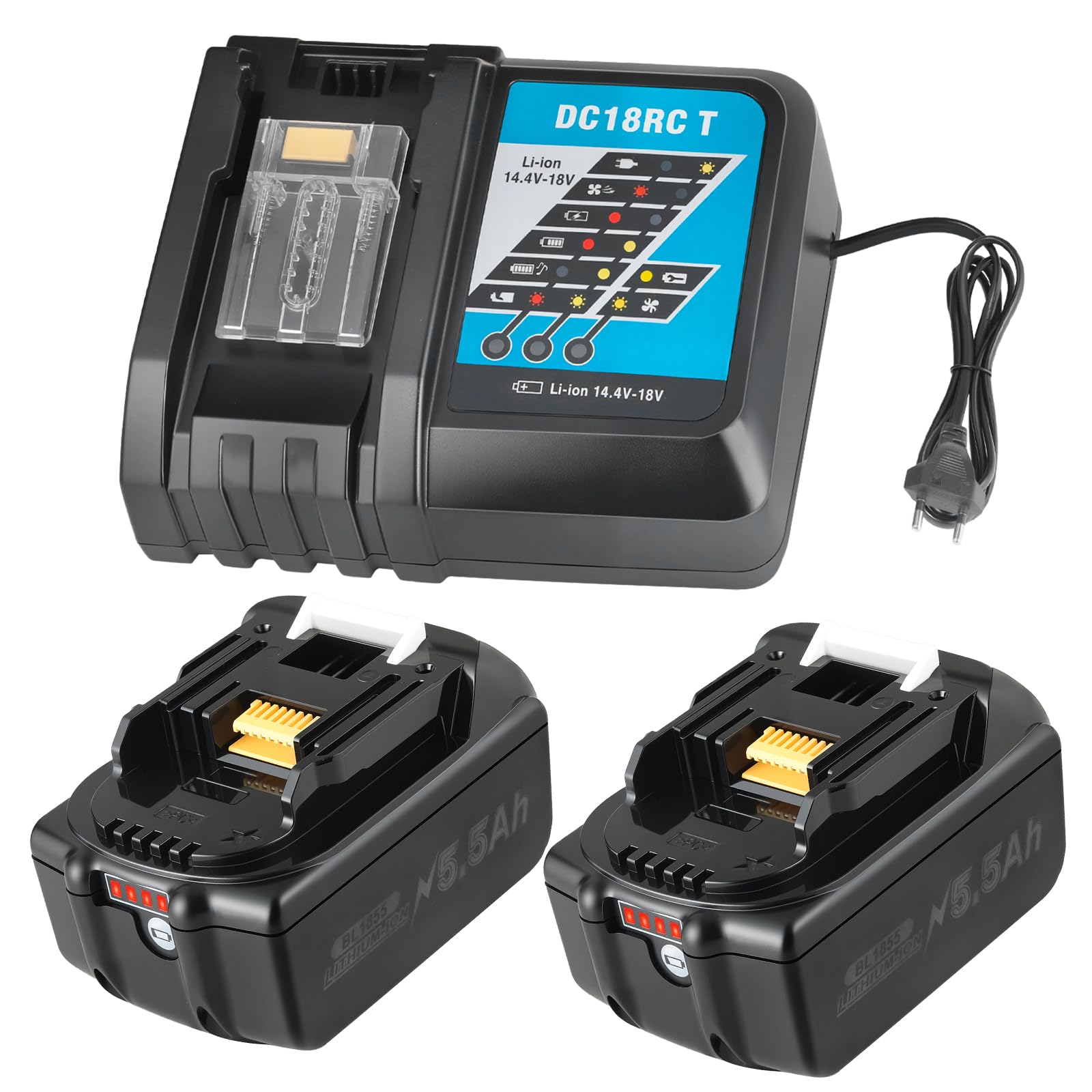 2 baterías de repuesto de 18 V y 5500 mAh para Makita Battery de 18 V con cargador DC18RC, compatible con BL1860 BL1860B BL1855 BL1855B BL1850 BL1850B BL1860B DC18RC