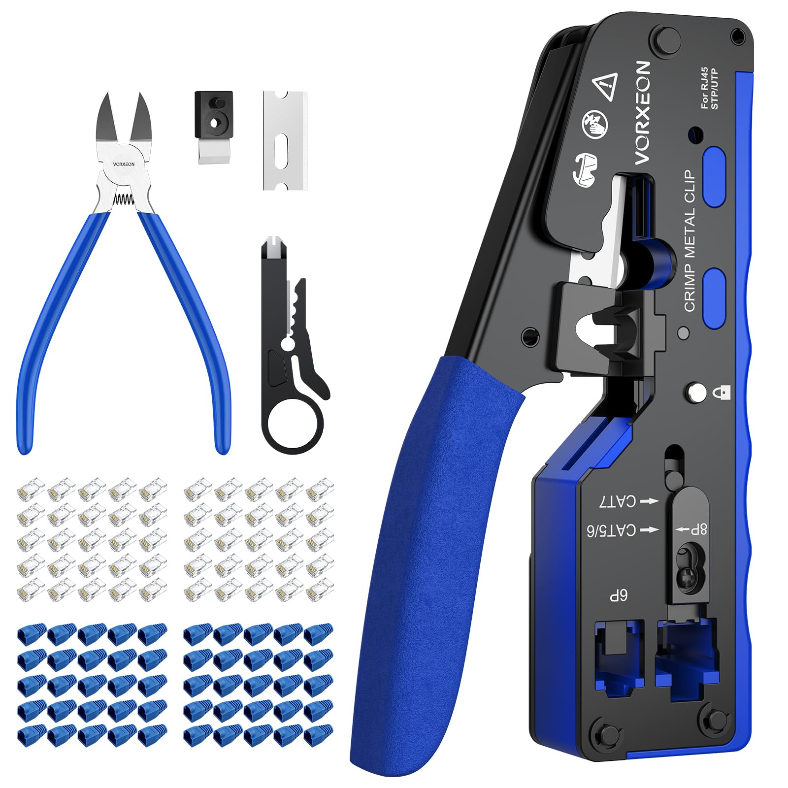 VORXEON Pinza Crimpadora RJ45 para Cat7 Cat6 Cat5 Cat5e Alicates de Terminales RJ45 RJ11 Herramienta para Trabajar con Cables de Red y Telefoníacon 6p8p Conectores Pasantes Cat6 50PCS y Fundas