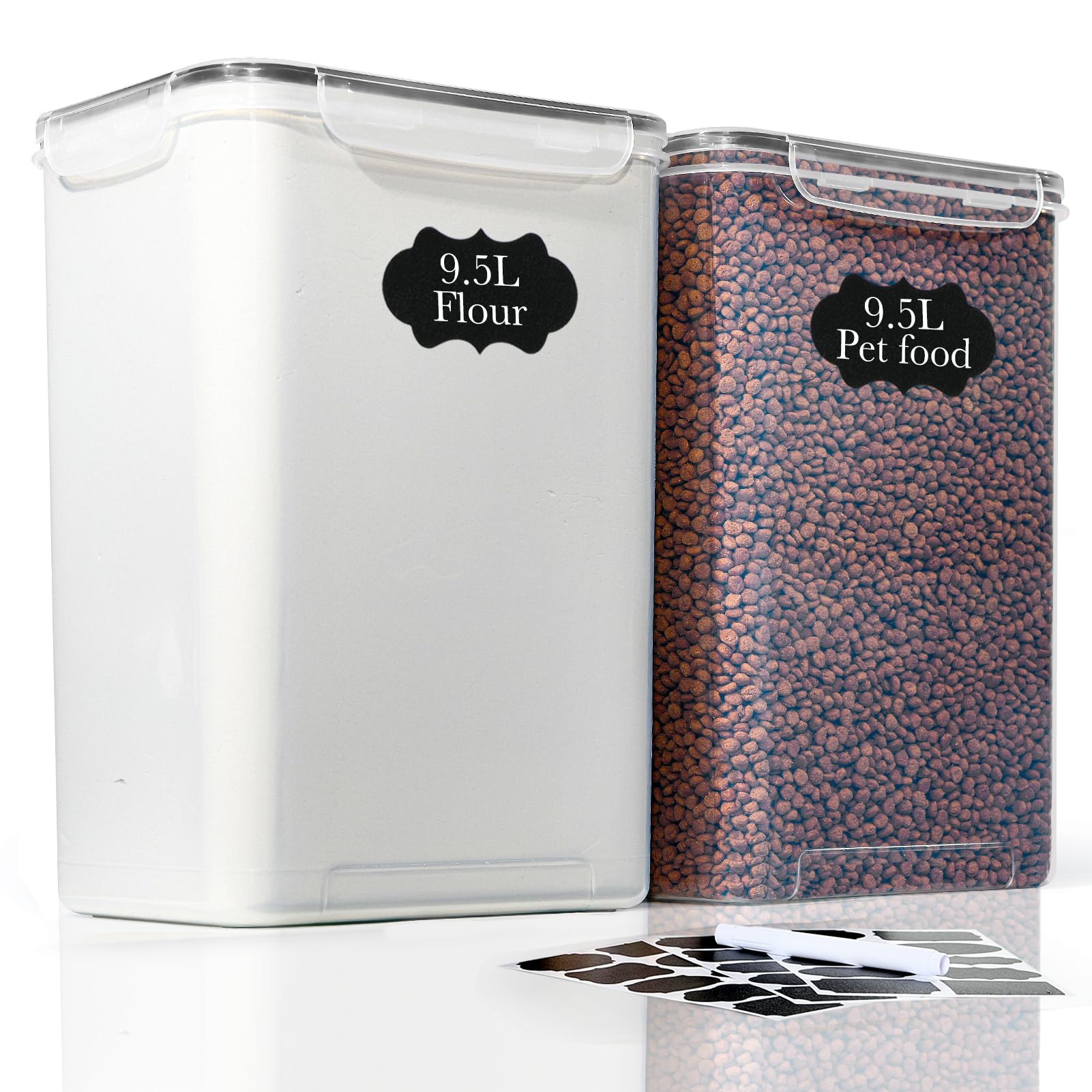 GoMaihe Juego de 2 tarros de almacenamiento XXL Contenedor grande de 9,5 l con etiqueta y bolígrafo | Almacenamiento de cocina, ideal para comida de mascotas | Sellado con tapa | Sin BPA