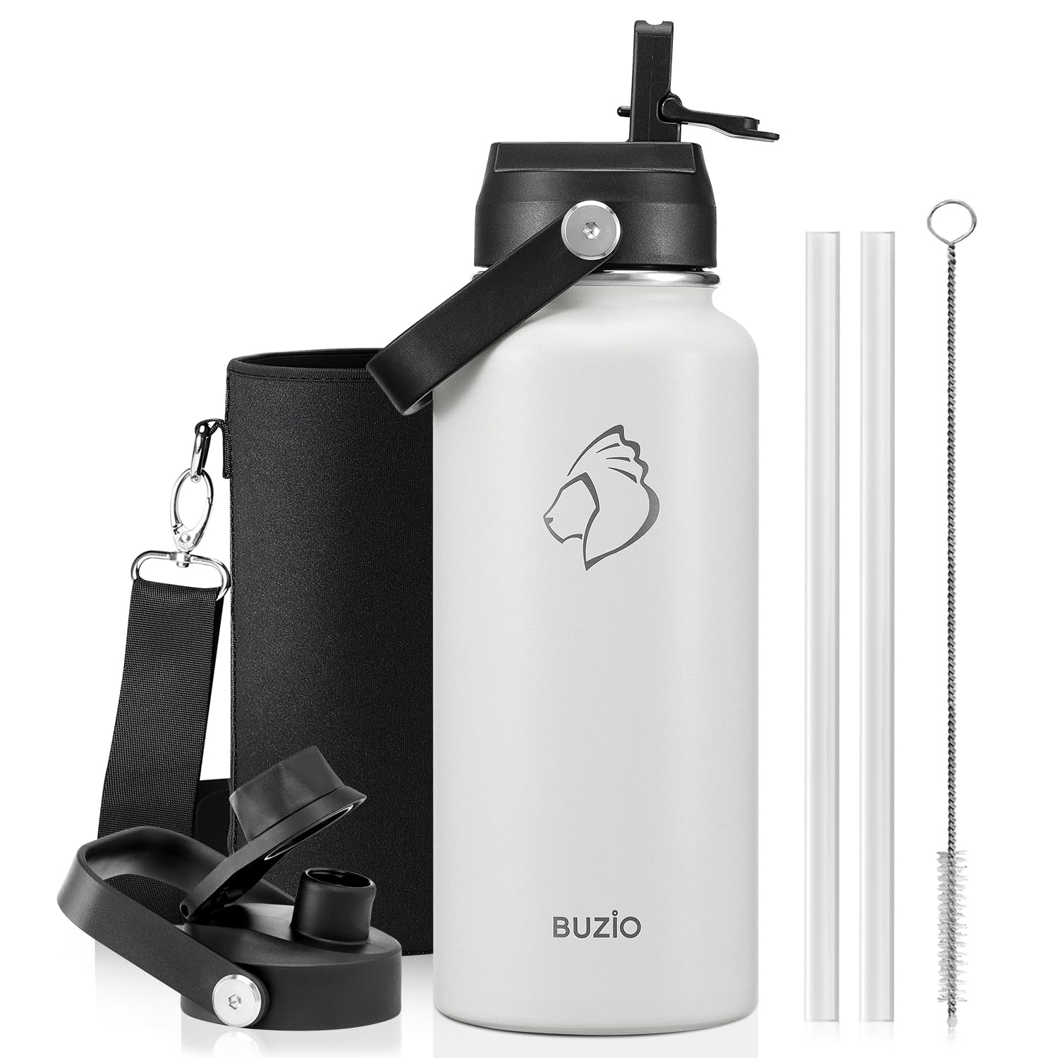 Botella de agua aislada BUZIO de 1 L, triple vacío de acero inoxidable con tapón de pajita, botella deportiva hermética para senderismo y deporte, mantiene frío 48h, Blanco