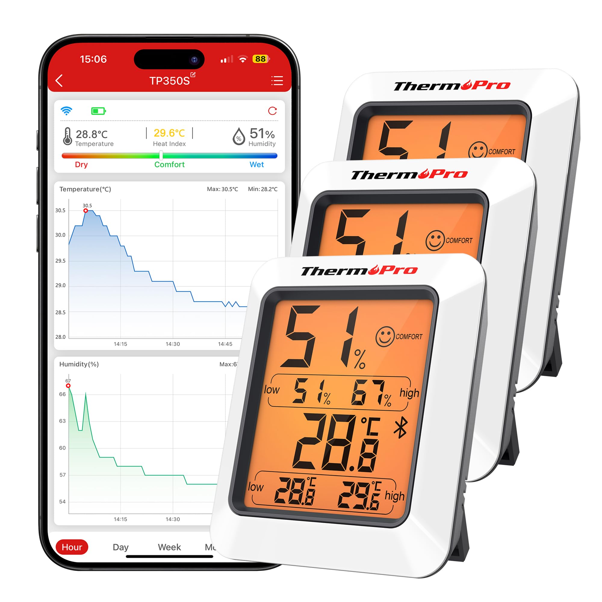 ThermoPro Termómetro higrómetro de 80 m, Bluetooth, termómetro interior, temperatura y humedad con aplicación, exportación de datos para interior, oficina, bodega, invernadero TP350, 3 unidades