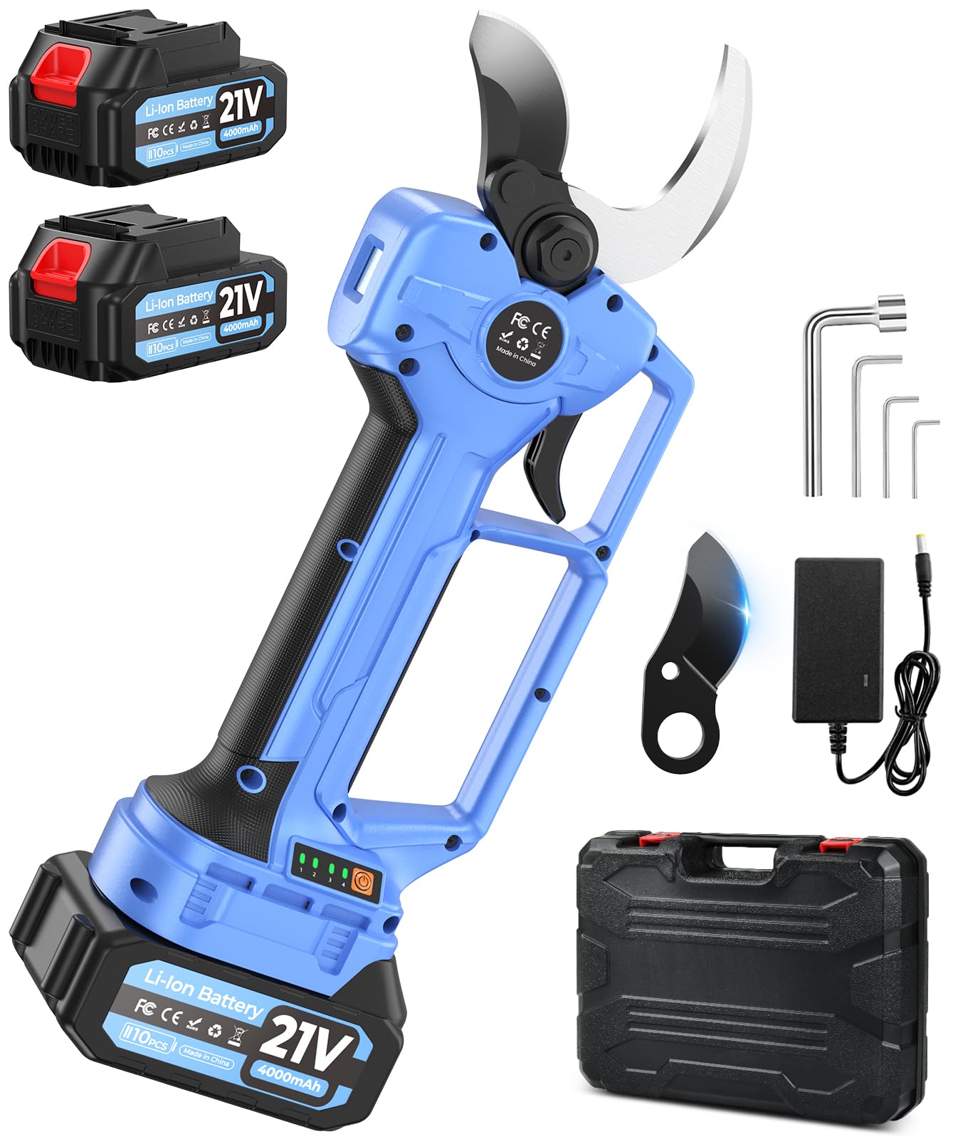 AUKUZI Tijeras Eléctricas Profesionales De 60 MM Cuentan Con Una Apertura De Hoja Ajustable En Cuatro Niveles, Motor sin escobillas de 1500W, Baterías 4.0 Ah x 2, Para Diversos Escenarios De Poda