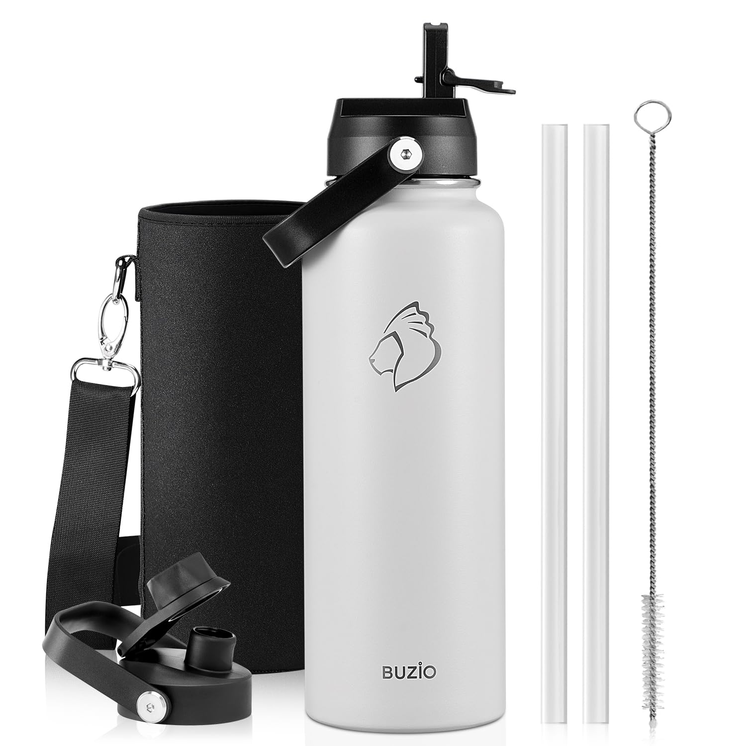 Botella de agua aislada BUZIO de acero inoxidable triple pared, mantiene frío 48h, hermética, sin BPA, boca ancha, jarra metálica con 2 tapones, Blanco