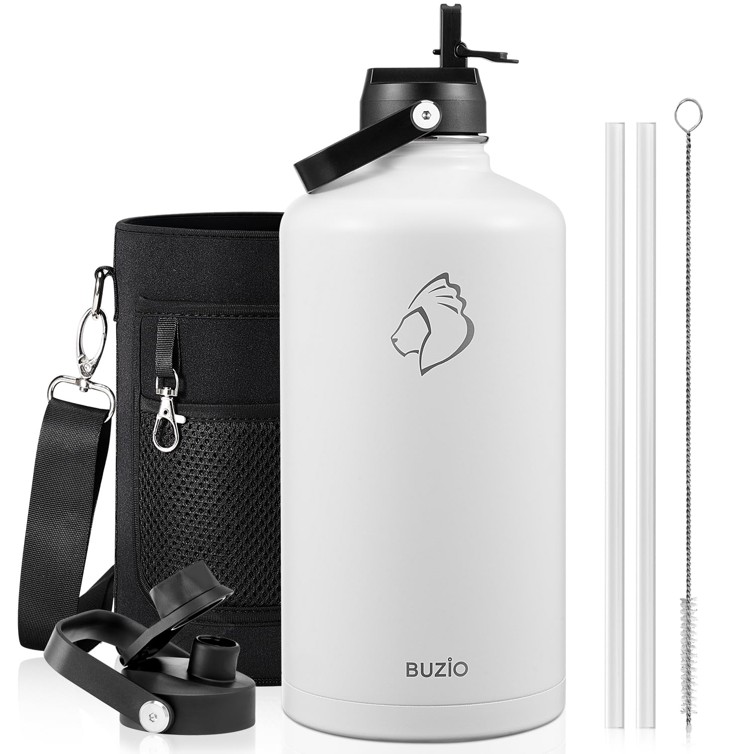 Botella de agua de galón BUZIO aislada, gran jarra de acero inoxidable al vacío, botella metálica grande, mantiene frío 48h, hermética, sin BPA, con pajita y tapón vertedor, Blanco
