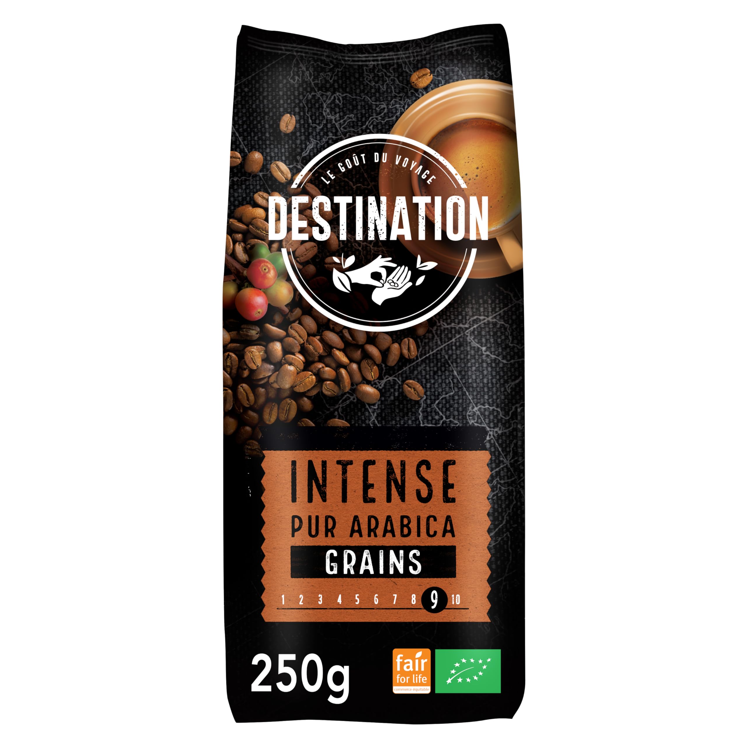 Destination – Café Ecológico Comercio Justo en Grano – 1 kg – Café Especialidad 100% Pur Arábica – Café Orgnánico – Tostado Artesanalmente – Ideal solo o con leche – Intensidad Muy Alta
