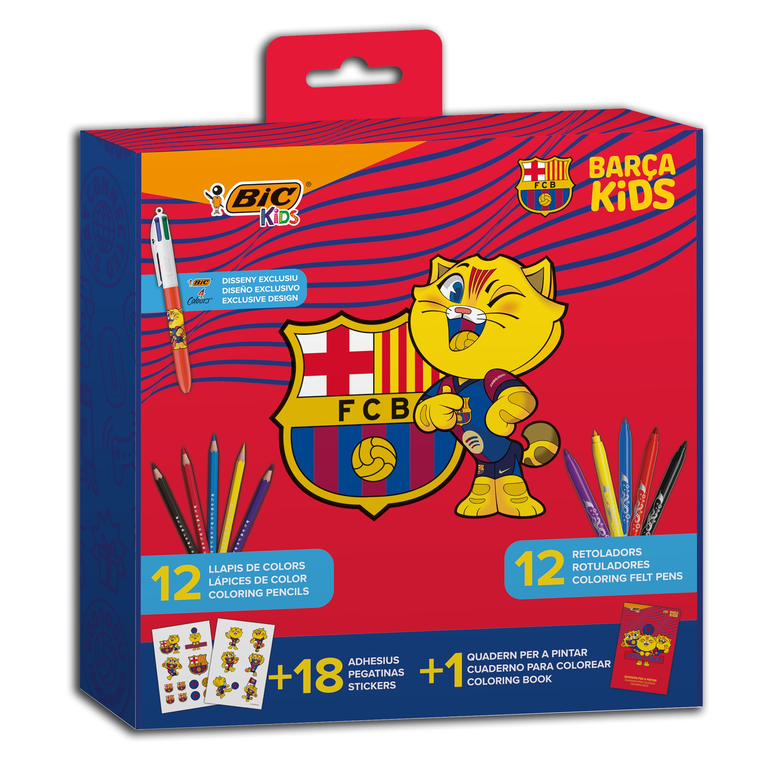 BIC Kids Kit de Colorear FC BARCELONA con Bolígrafo 4 Colores Exclusivo: CAT, 12 Lápices de Colores BIC Tropicolors, 12 Rotuladores Kid Couleur, Cuaderno para Colorear y 18 Pegatinas del FC Barcelona