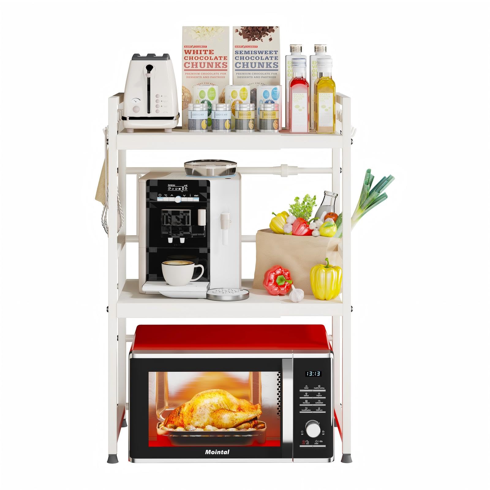 Mointal Estante Expandible para Microondas, Soporte de 3 Niveles para Microondas de Cocina, Soporte de Acero al Carbono para Microondas de Encimera, Organizador de Cocina con 8 Ganchos, Blanco