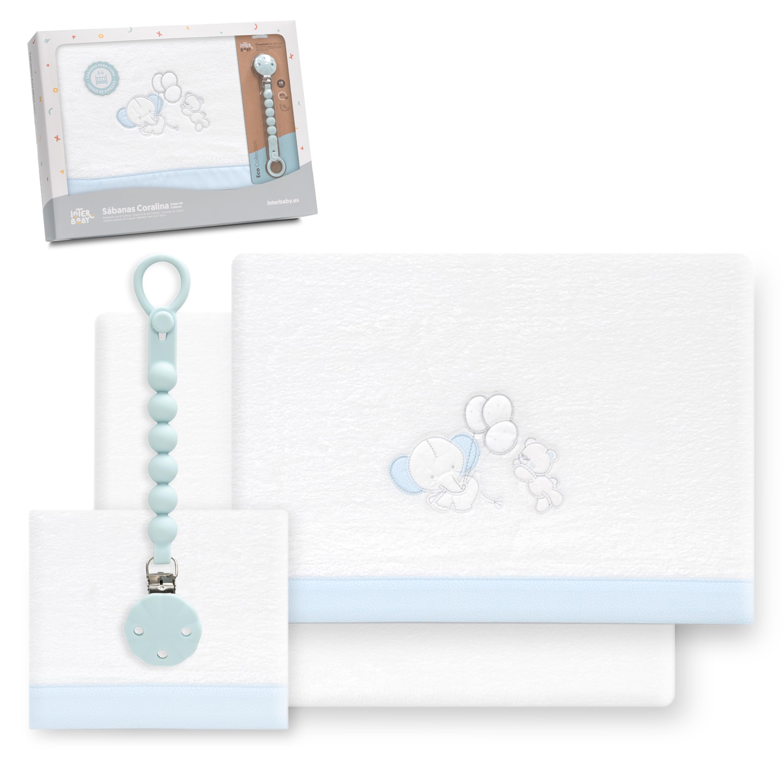 Interbaby – Juego Sabanas Cuna 60×120 Poliester 100% | Sabana Cuna Coralina, Cálida | Incluye Sabana Bajera, Encimera y Funda de Almohada | Ideal para Invierno | Elefante Globo Corazón Blanco/Azul